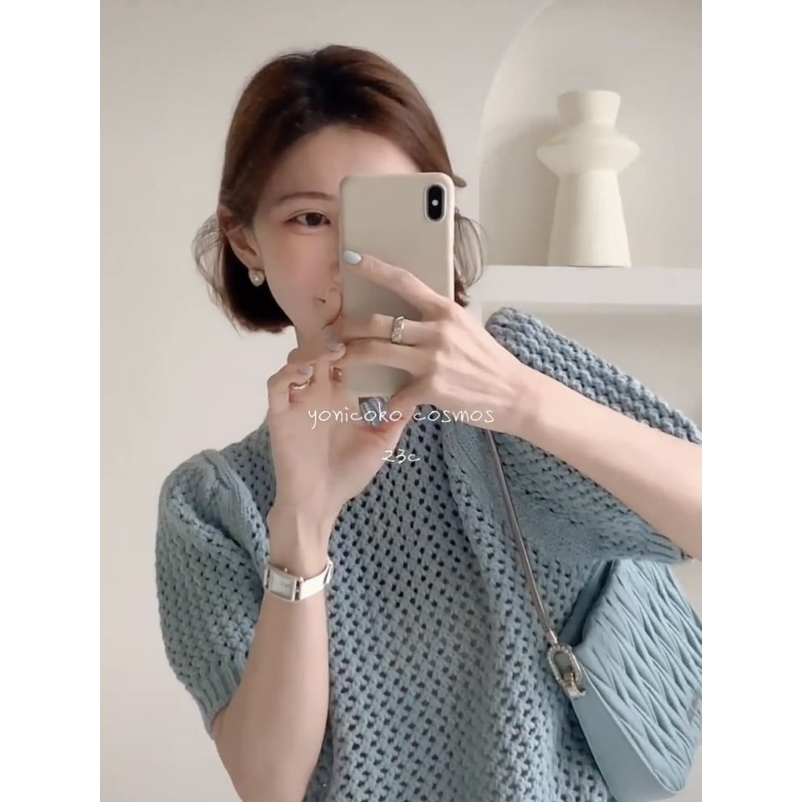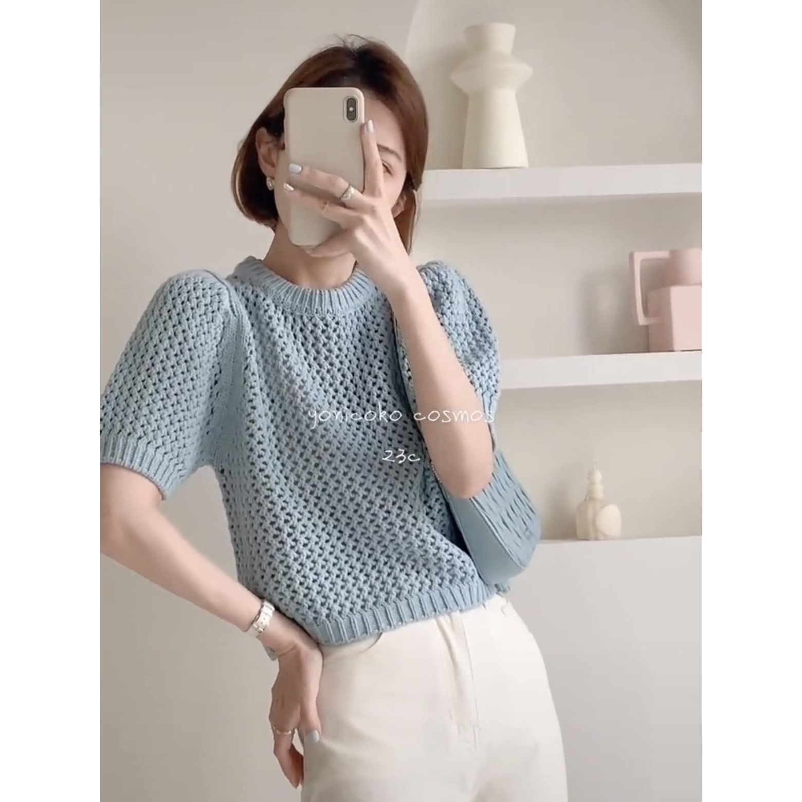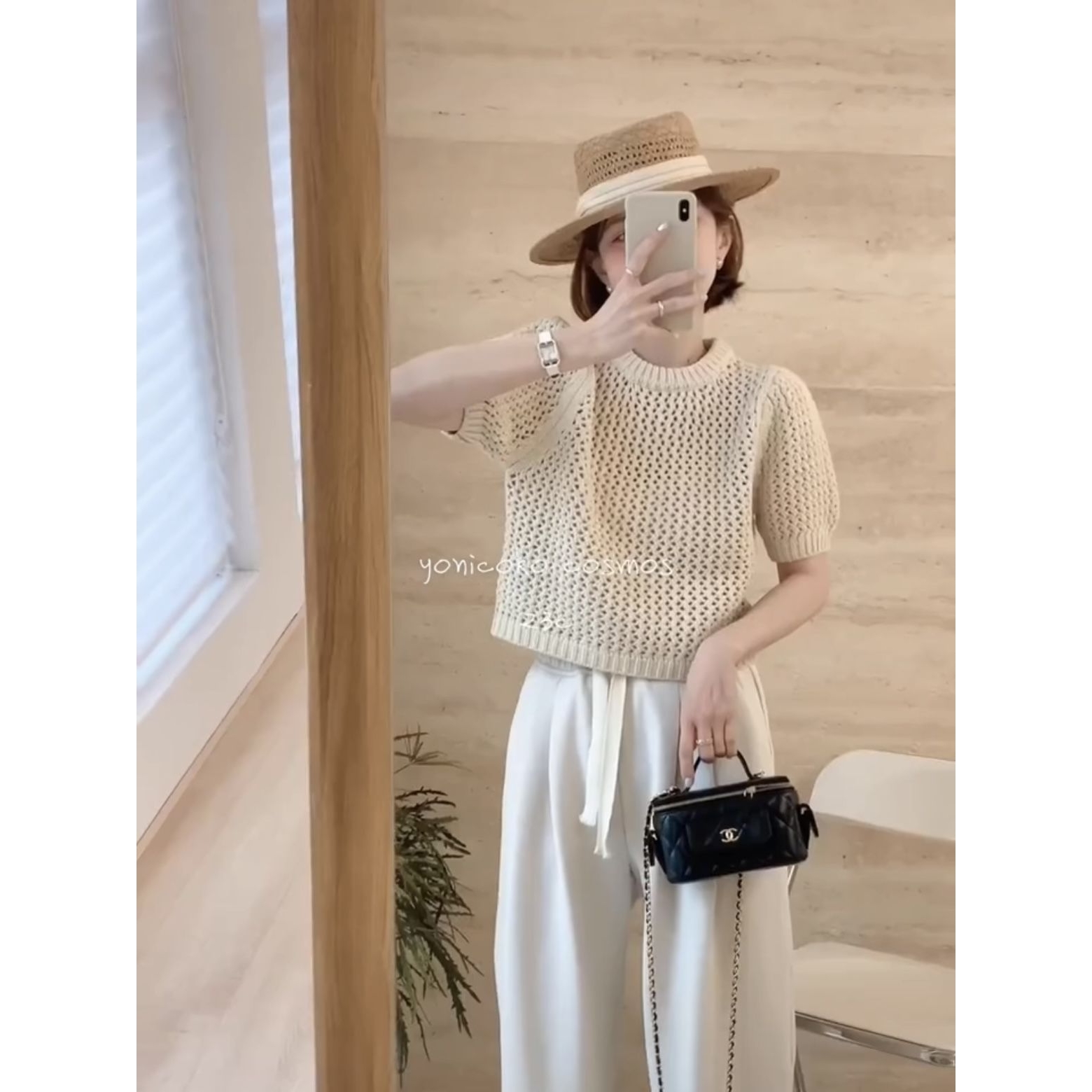 【店铺热销】韩国东大门奶系圆领套头镂空短袖针织衫女高级感韩系