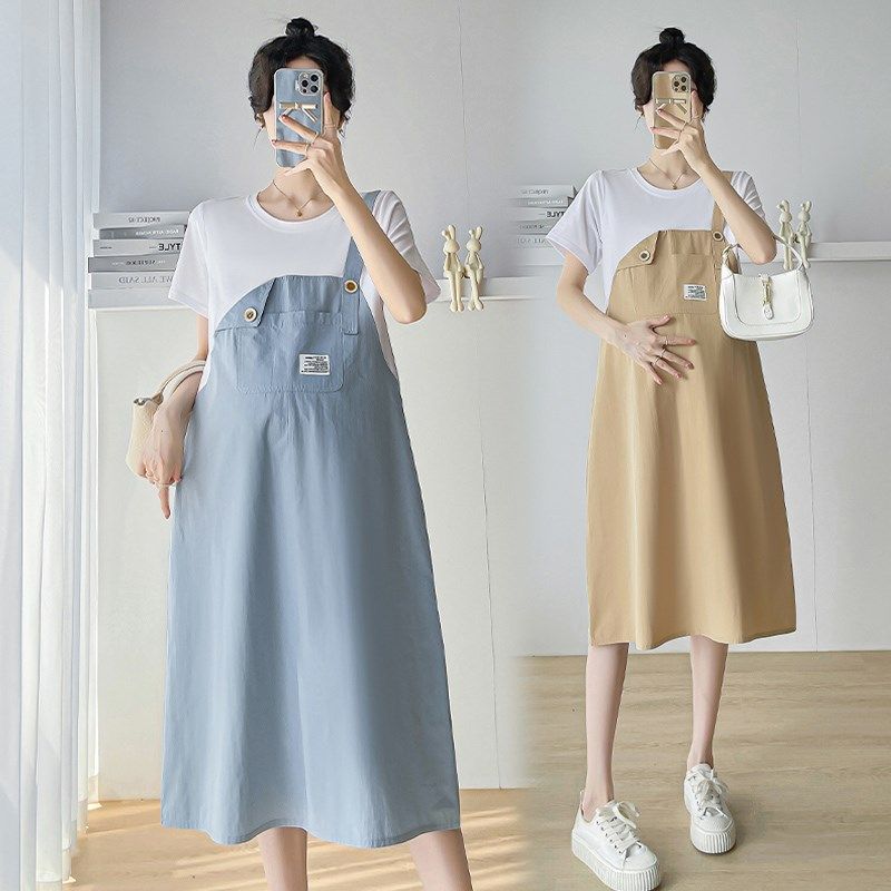 孕妇装夏装连衣裙时尚假两件背带裙宽松中长款显瘦潮妈夏天裙子女