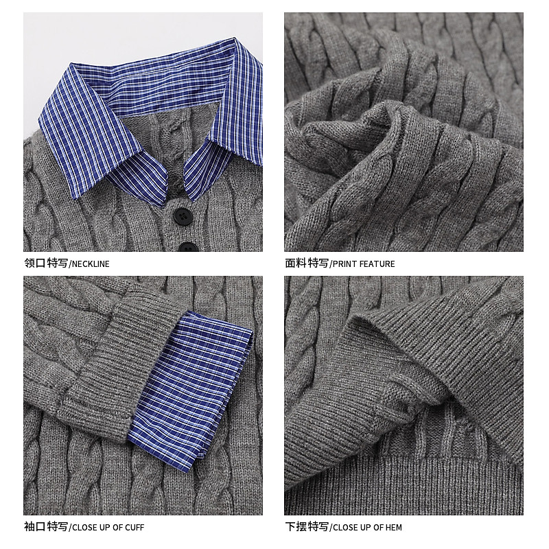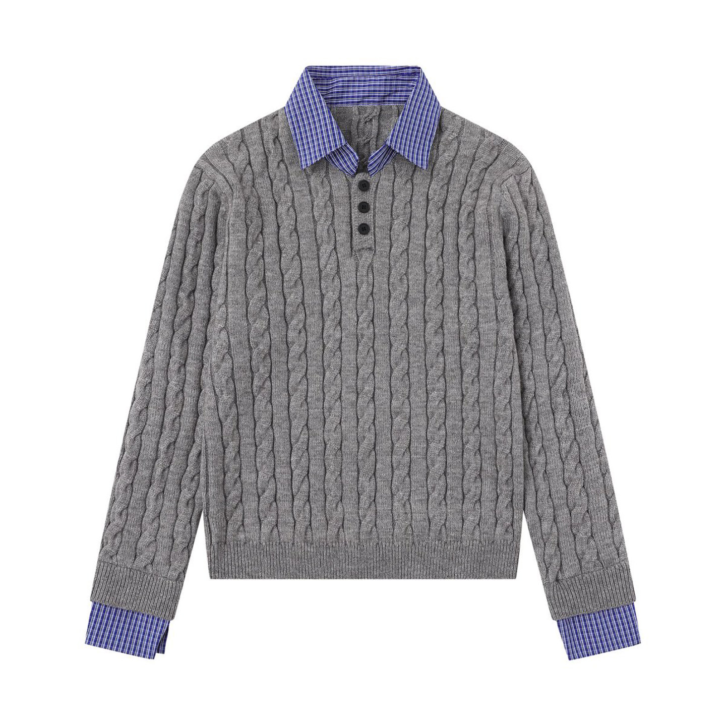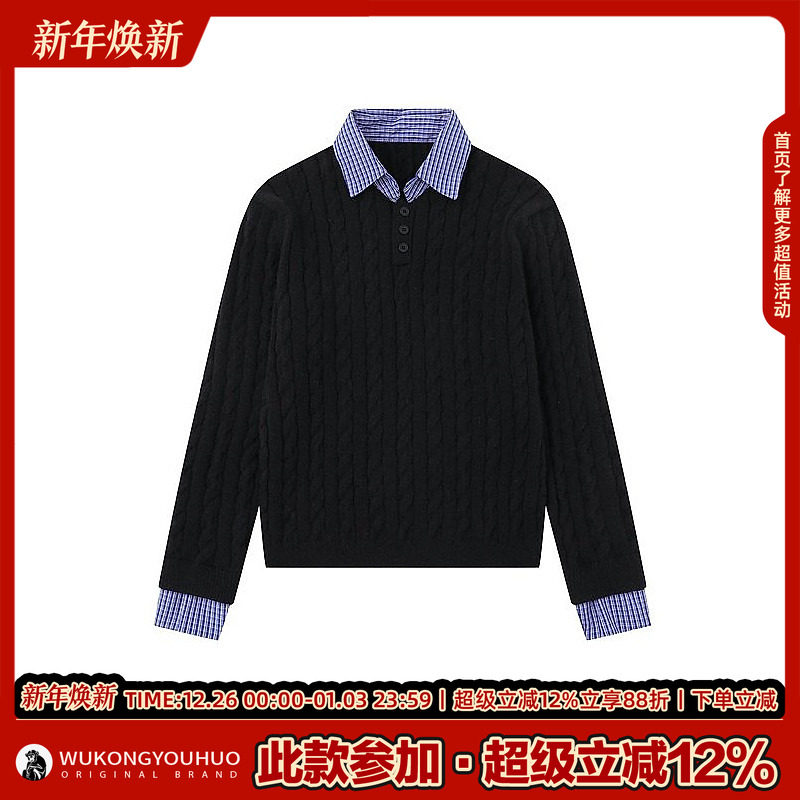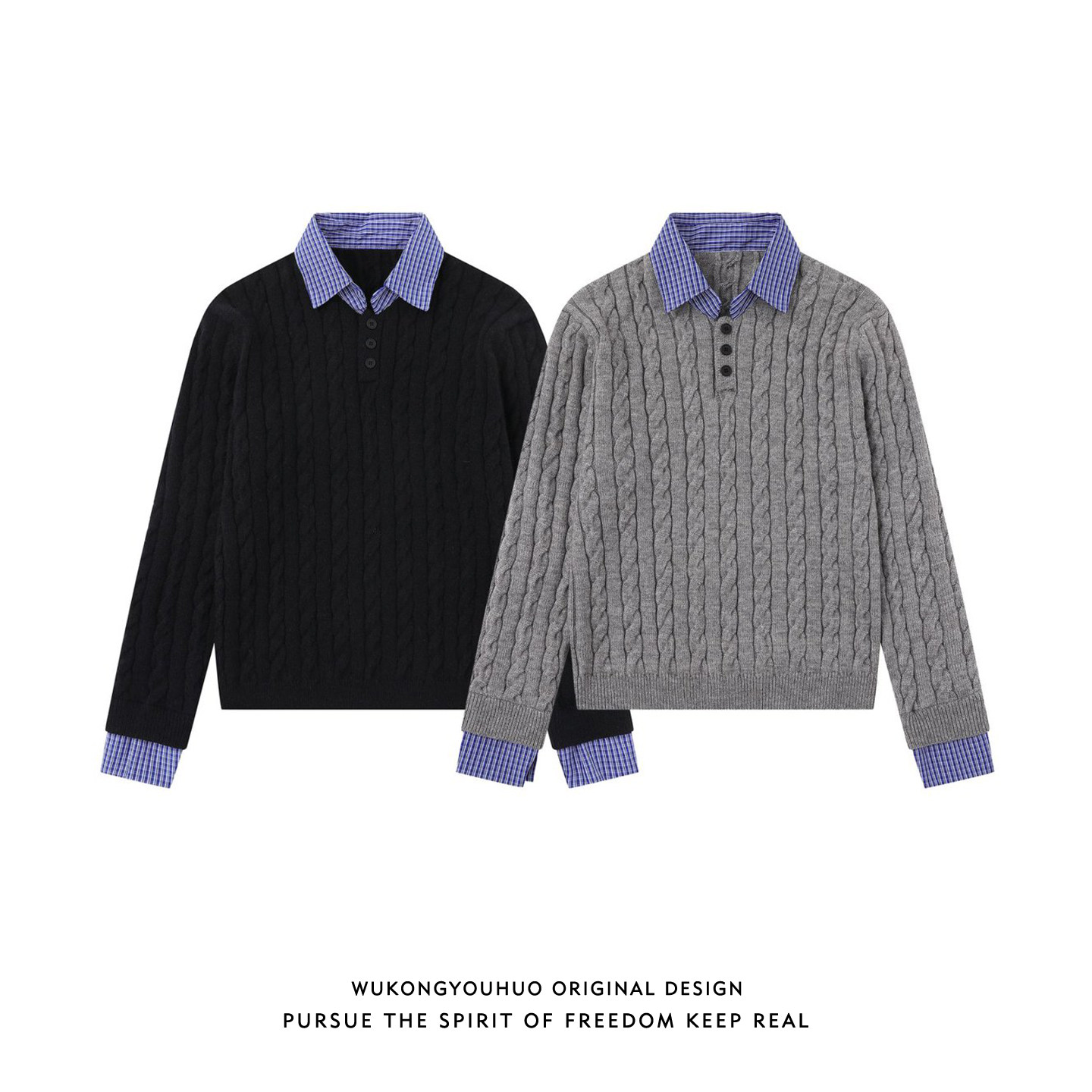 悟空有货复古条纹假两件拼接短款毛衣男女秋季情侣宽松休闲针织衫