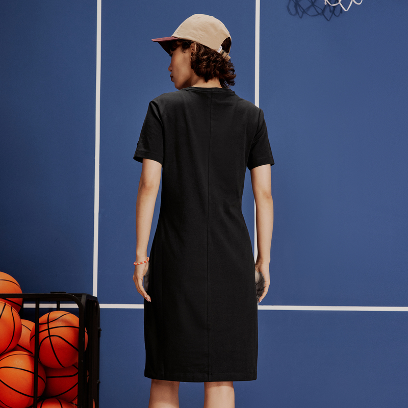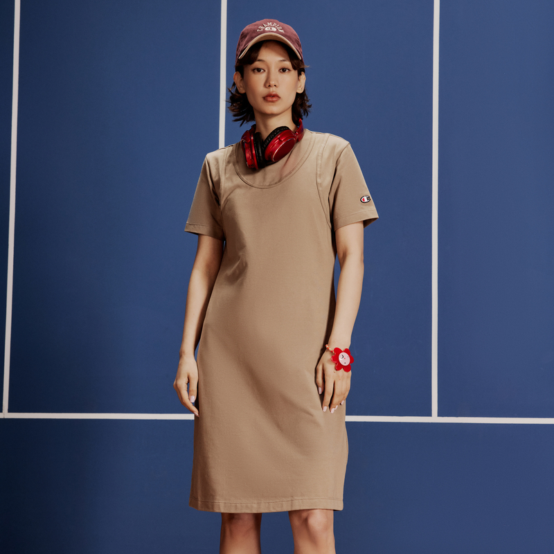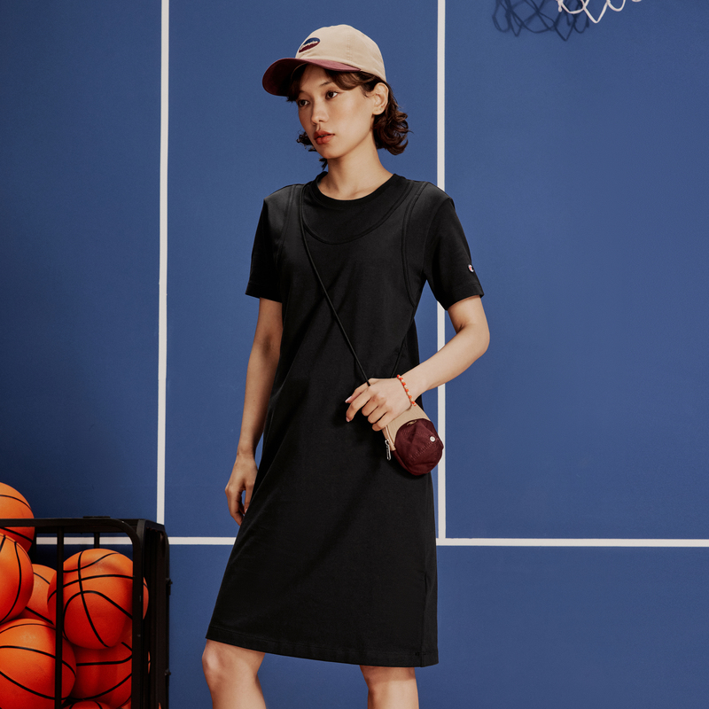 Champion冠军连衣裙夏季官方纯色圆领短袖假两件叠穿式长裙女