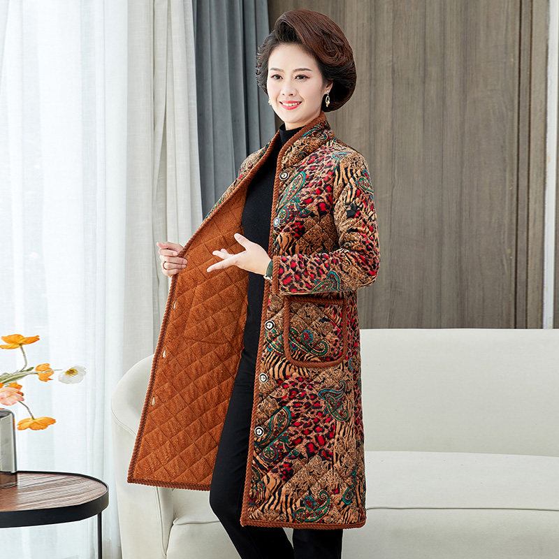 早春防寒保暖妈妈装加绒棉衣长款棉服外套中老年女装加长轻薄棉袄