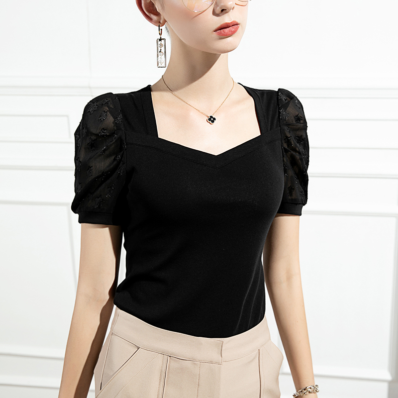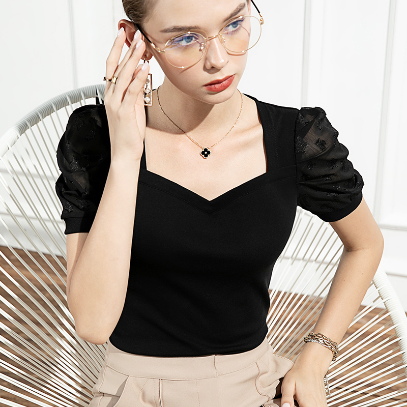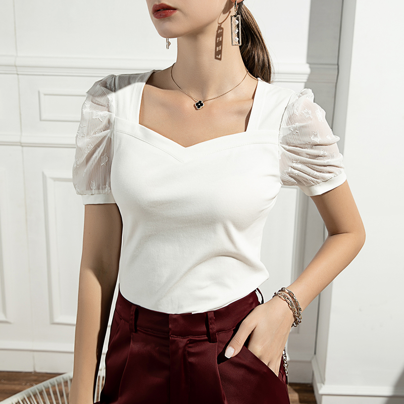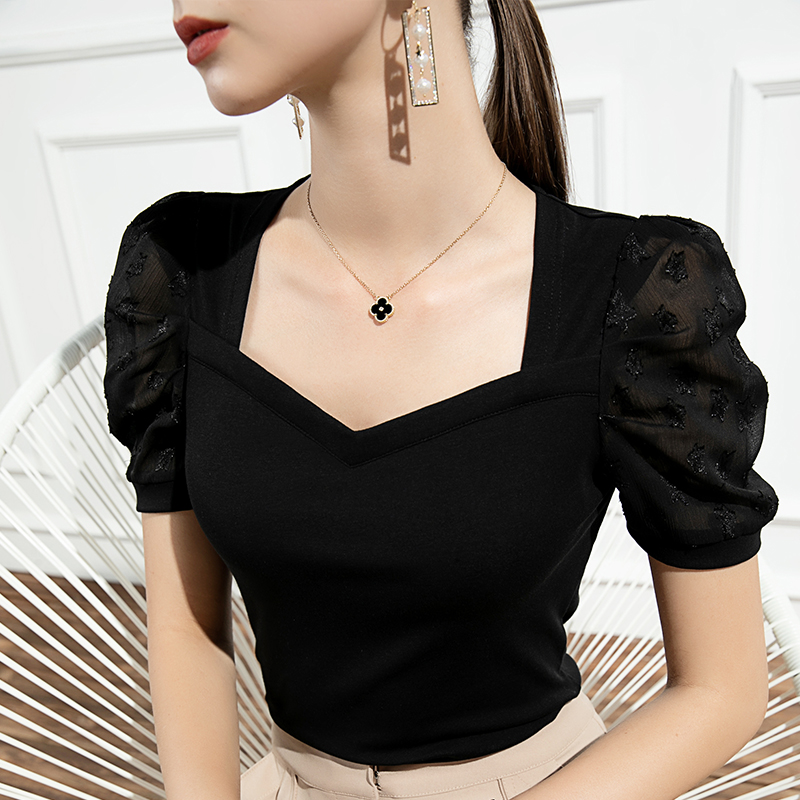 2025春夏雪纺提花T恤女短袖泡泡袖纯色洋气方领夏装上衣欧洲站