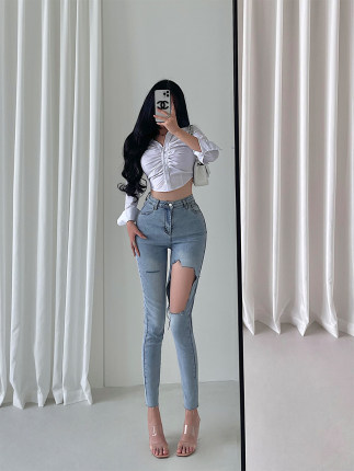YoungGirlDay辣妹性感高腰提臀紧身显瘦破洞九分小脚铅笔裤牛仔裤