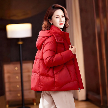 大码女装红色冬季新款棉衣宽松加厚保暖羽绒棉服外套短款中年妈妈
