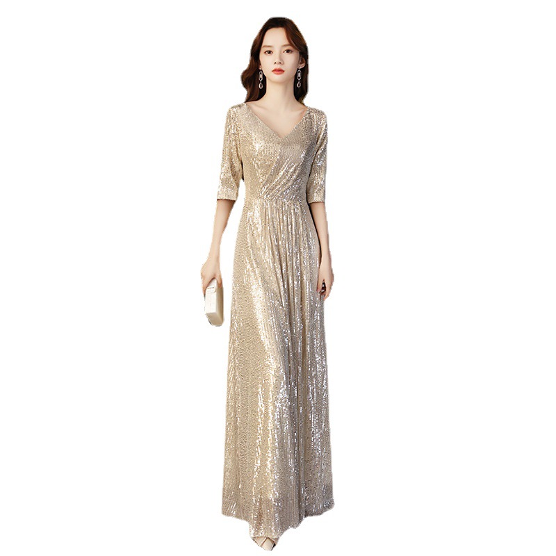 金色宴会晚礼服女2025新款平时可穿晚礼服裙主持晚宴年会礼服
