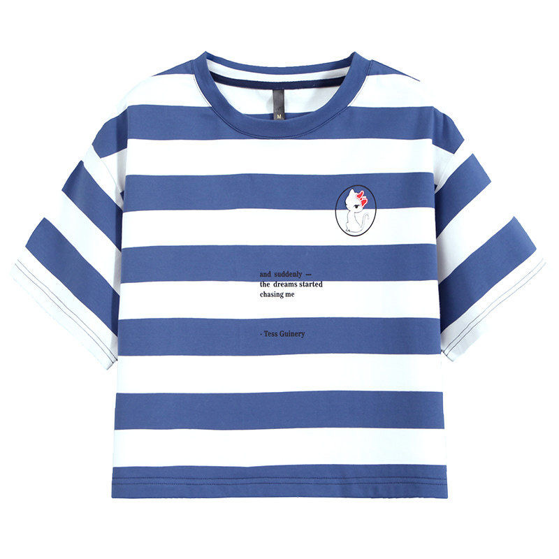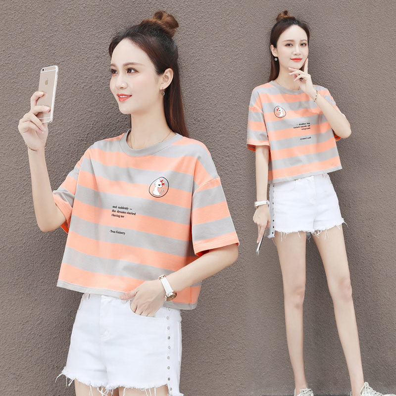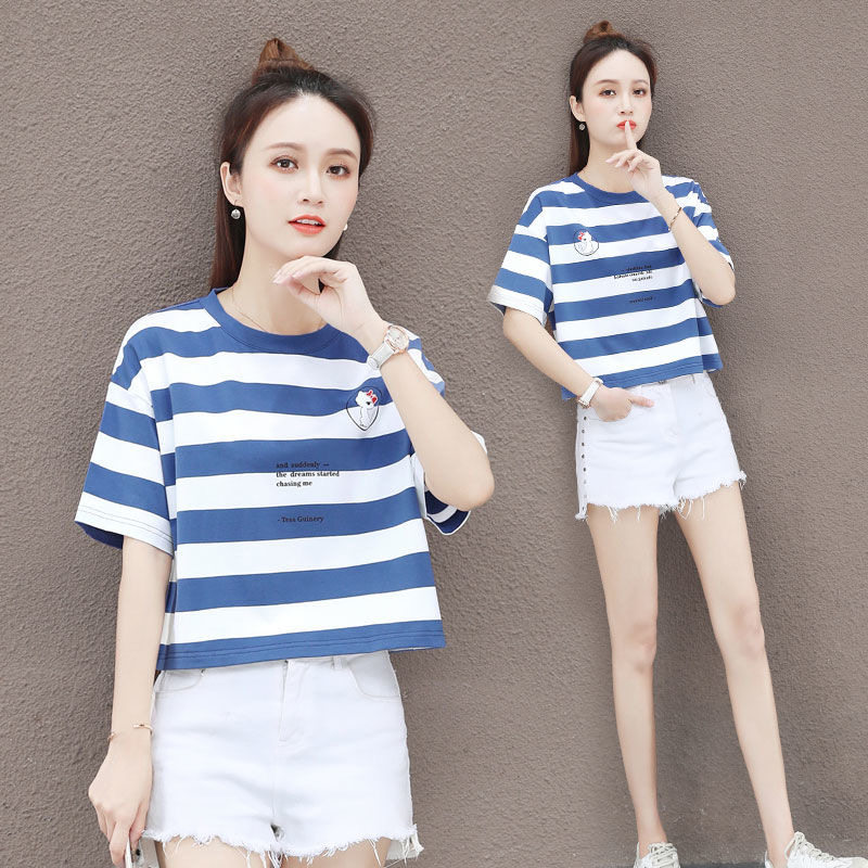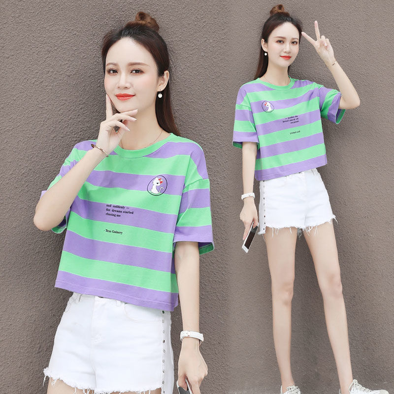 100%品质T恤女夏装2025新款韩版宽条纹打底衫短款流行休闲上衣潮