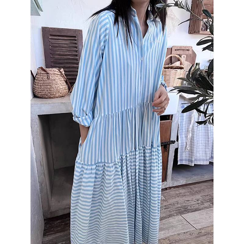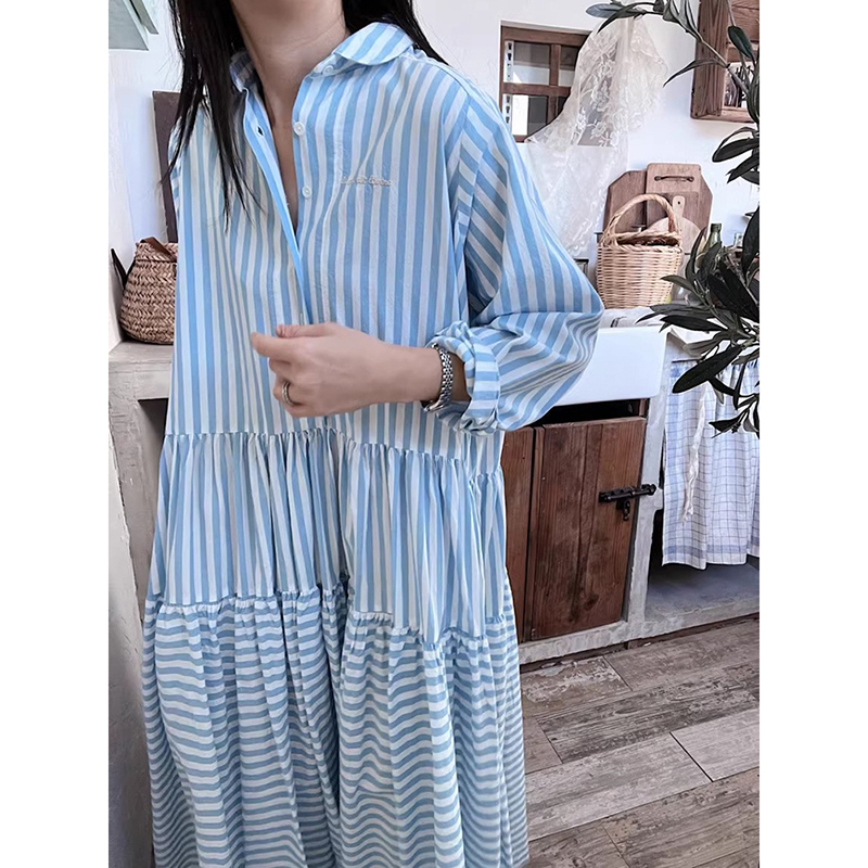 良良家撞色条纹衬衫式连衣裙女春季新款小众慵懒风宽松荷叶边长裙