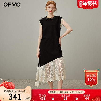 dfvc黑色气质蕾丝拼接背心裙t恤裙女2025夏季新款无袖连衣裙长裙