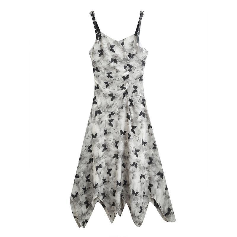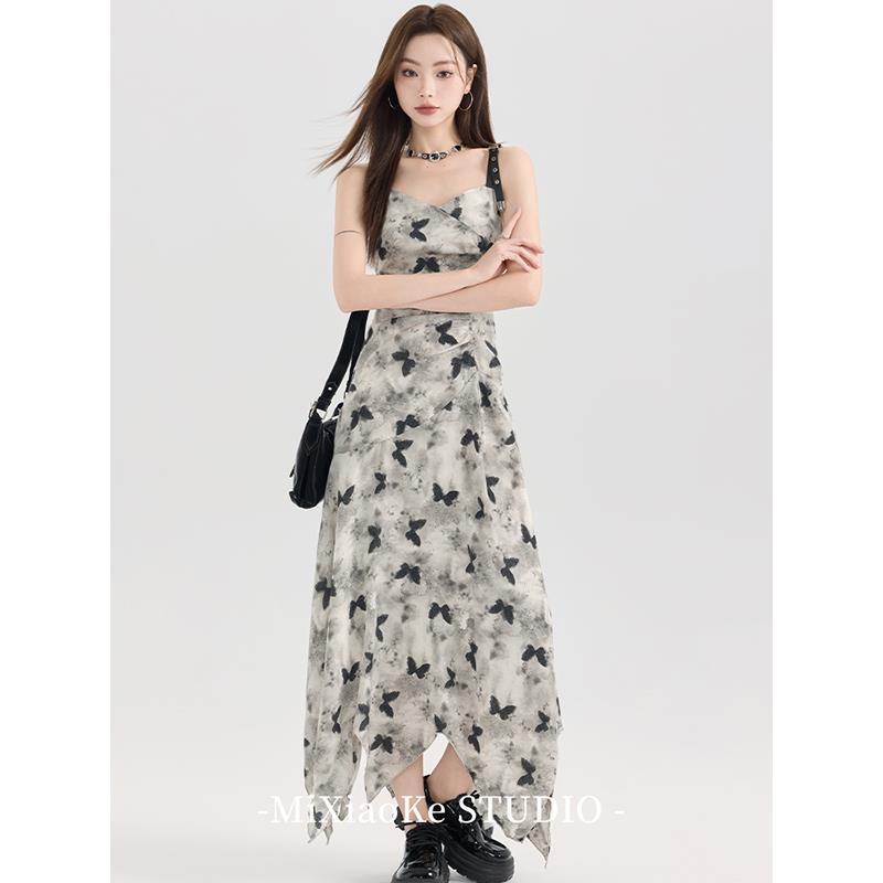芈小可法式水墨画碎花吊带连衣裙女夏季气质长裙不规则裙子小个子