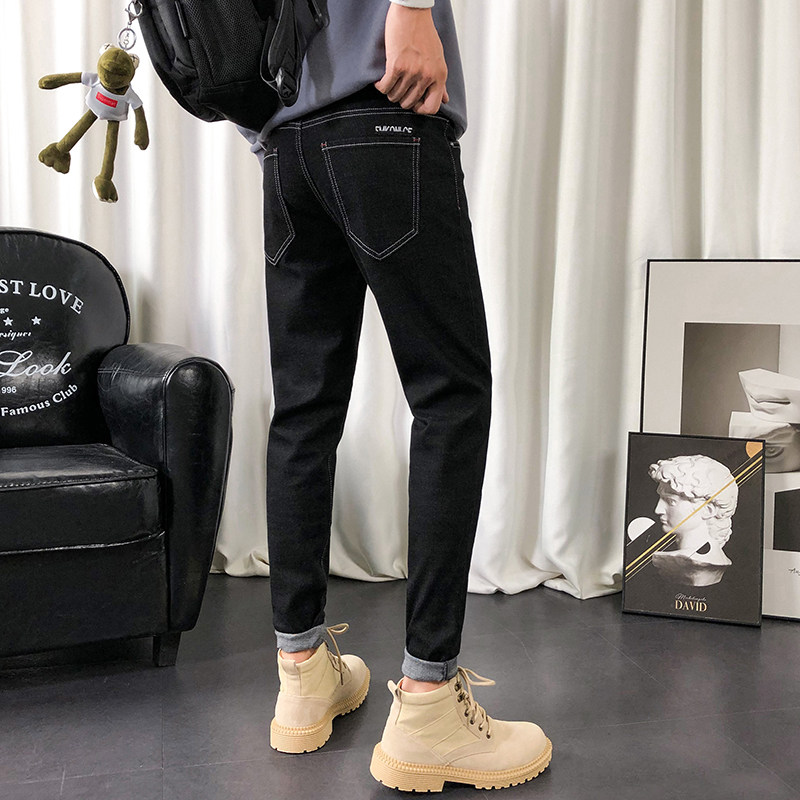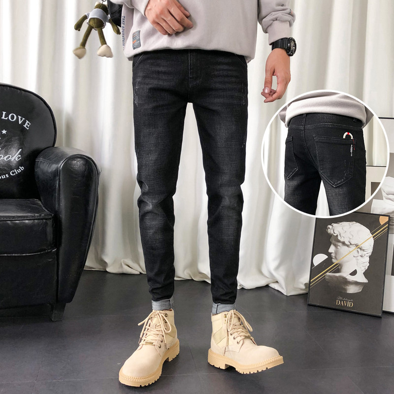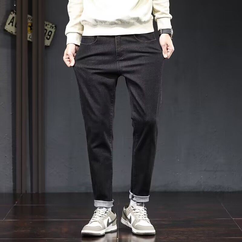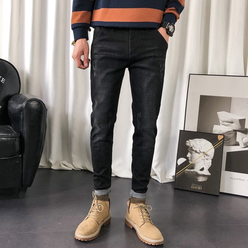 牛仔裤2025新款男网红修身小脚长裤潮搭配马丁靴的裤子皮带款黑色