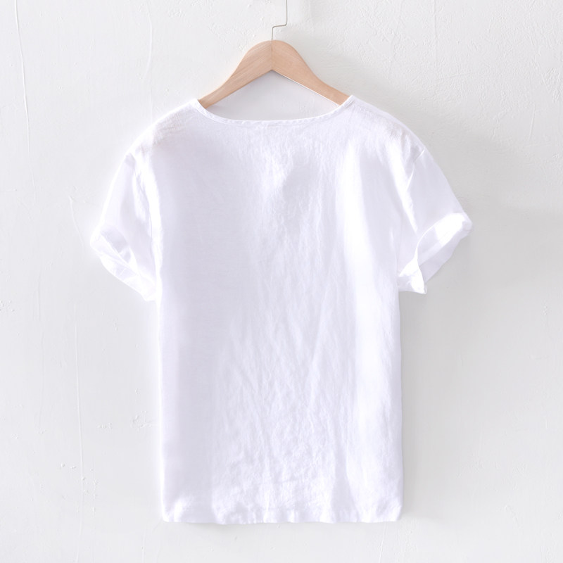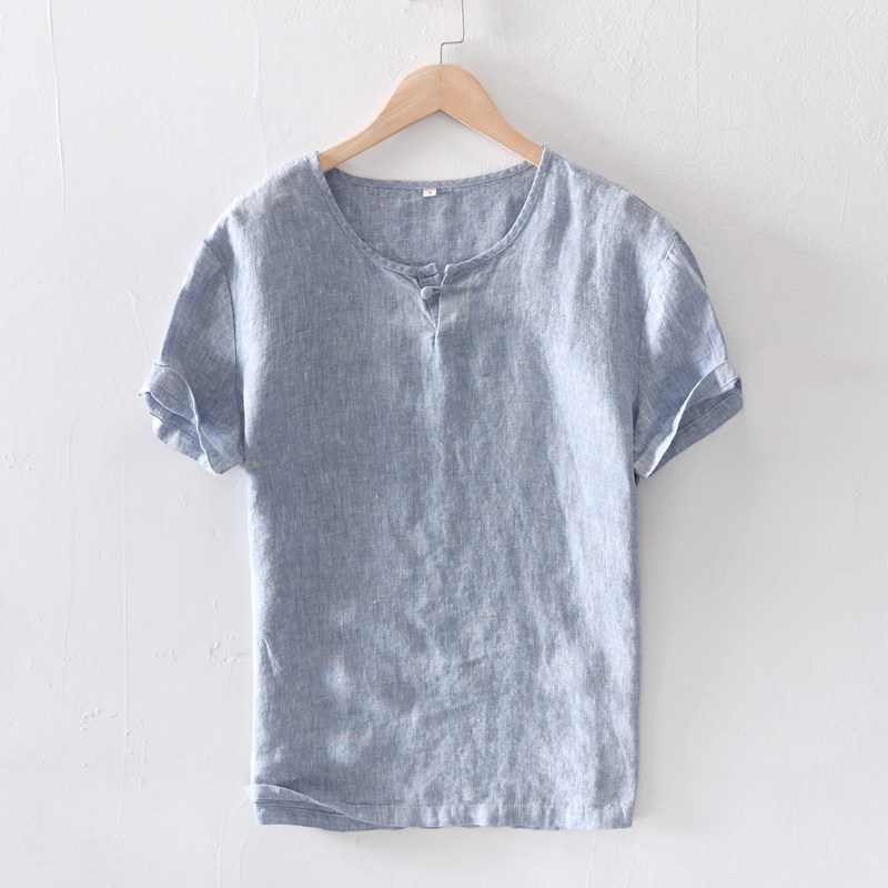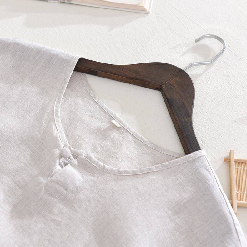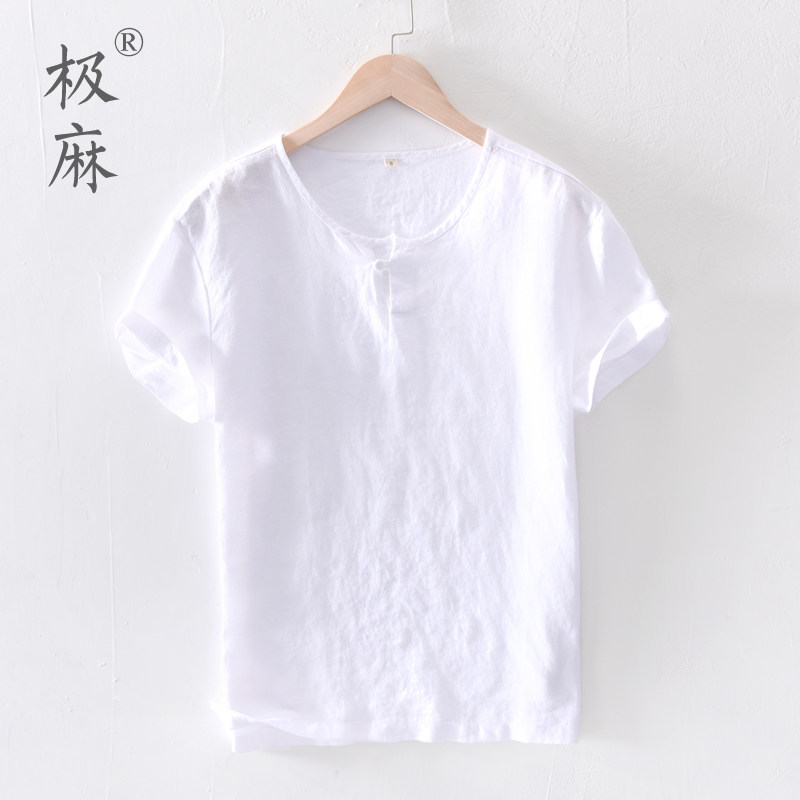 极麻盘扣圆领大码短袖亚麻T恤男士日系休闲透气文艺宽松棉麻汗衫