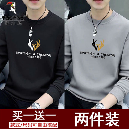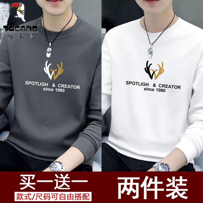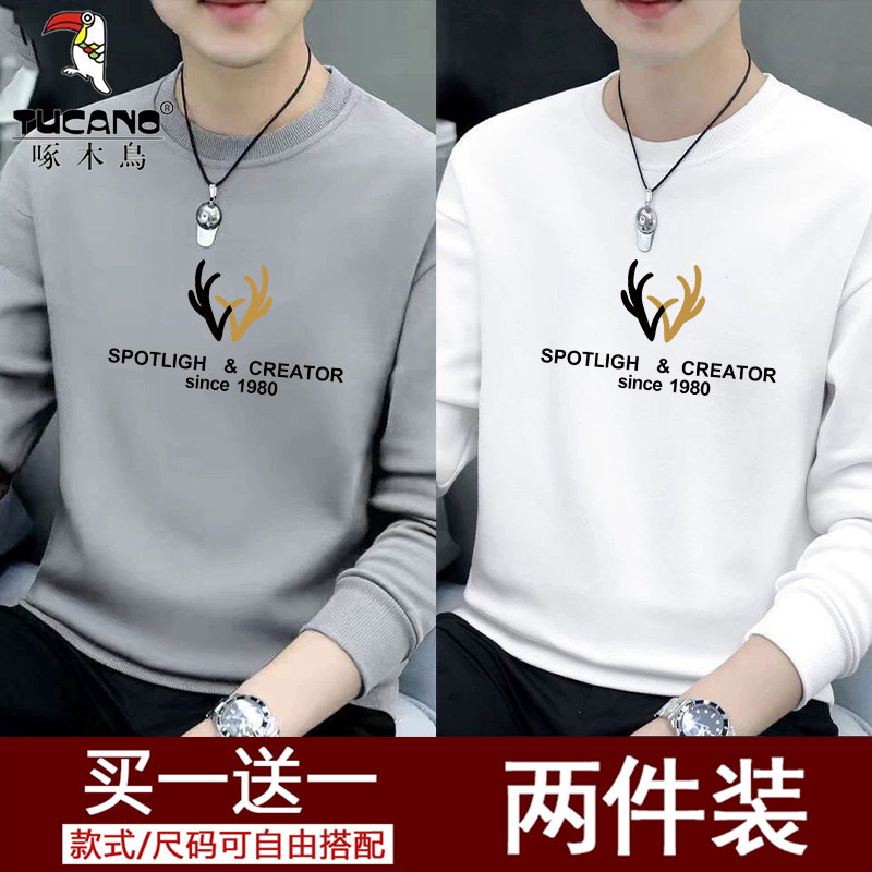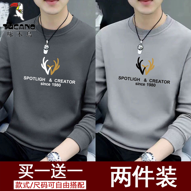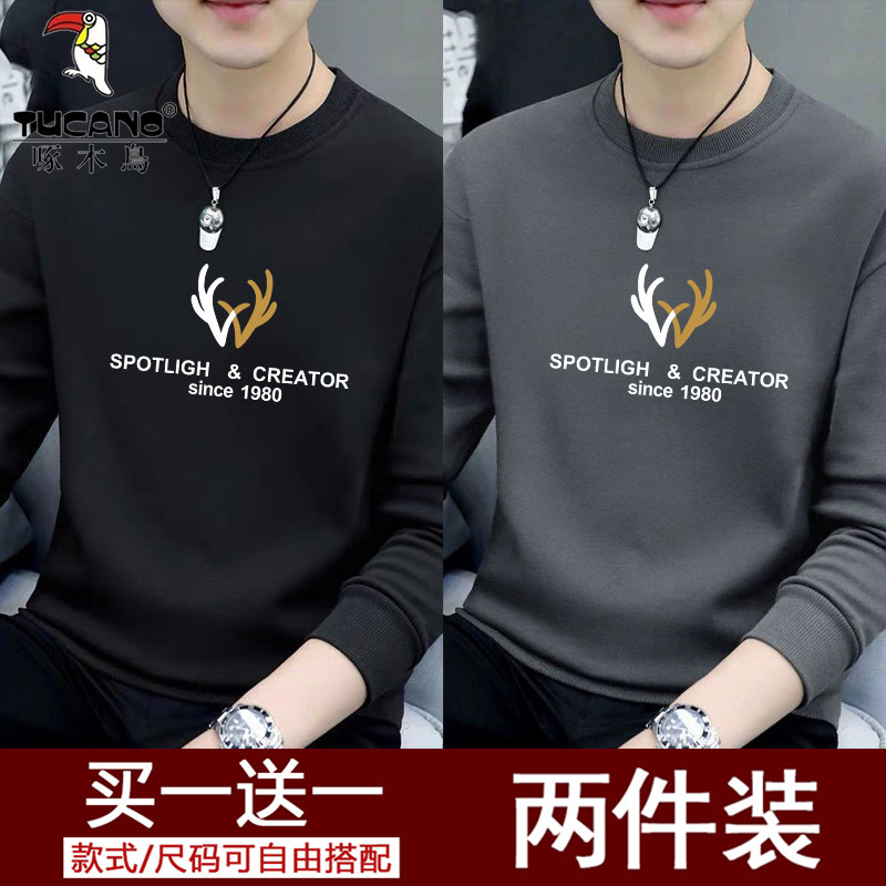 啄木鸟秋冬季加绒卫衣男休闲百搭圆领新款长袖T恤男士上衣打底衫