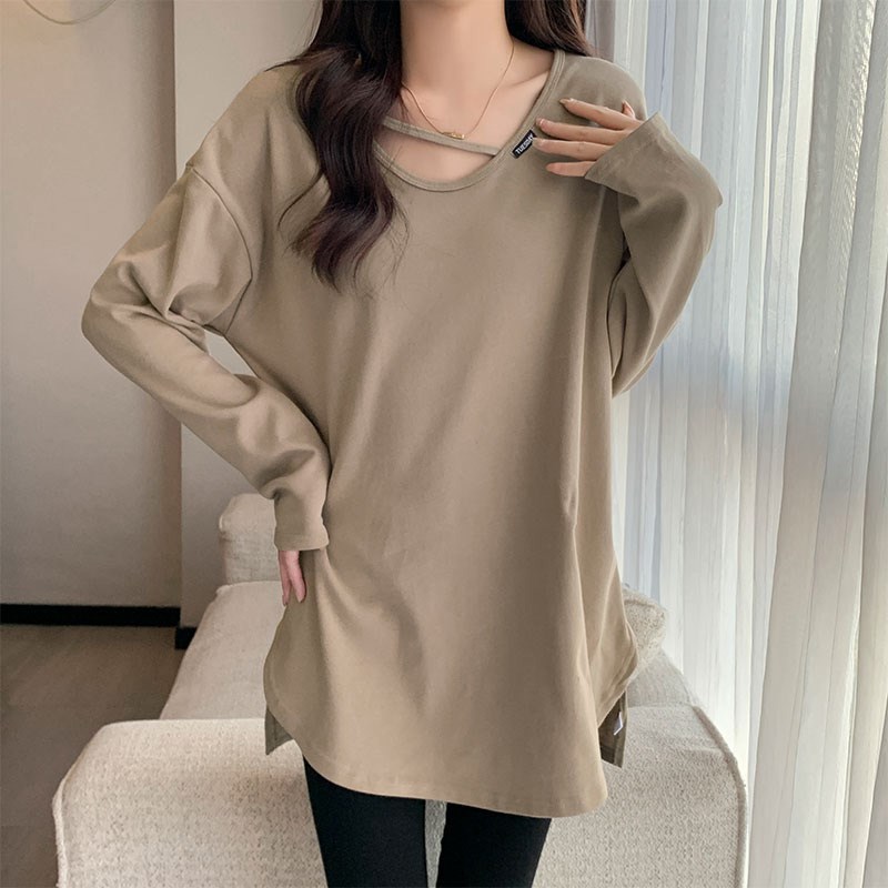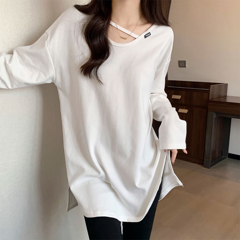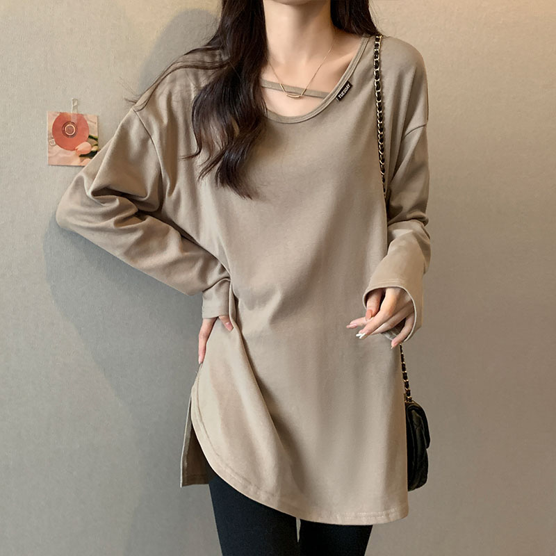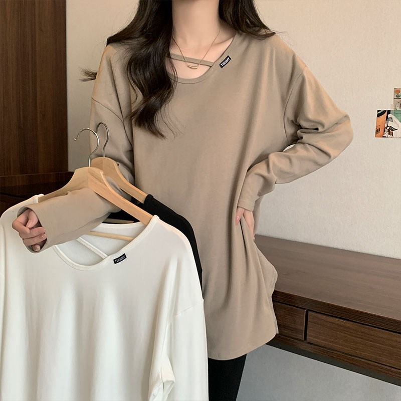 疏离感中长款长袖T恤女春秋欧货大版遮屁股打底卫衣配鲨鱼裤上衣