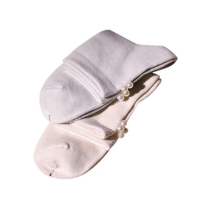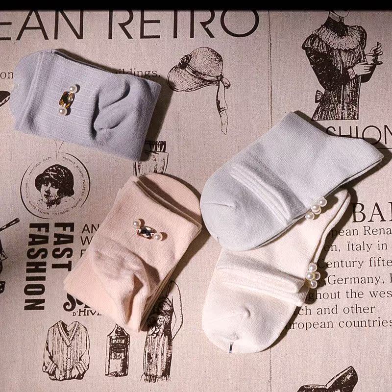 日本原单后跟钻饰装饰袜纯棉女士中筒袜ins校园风纯色街拍潮袜女