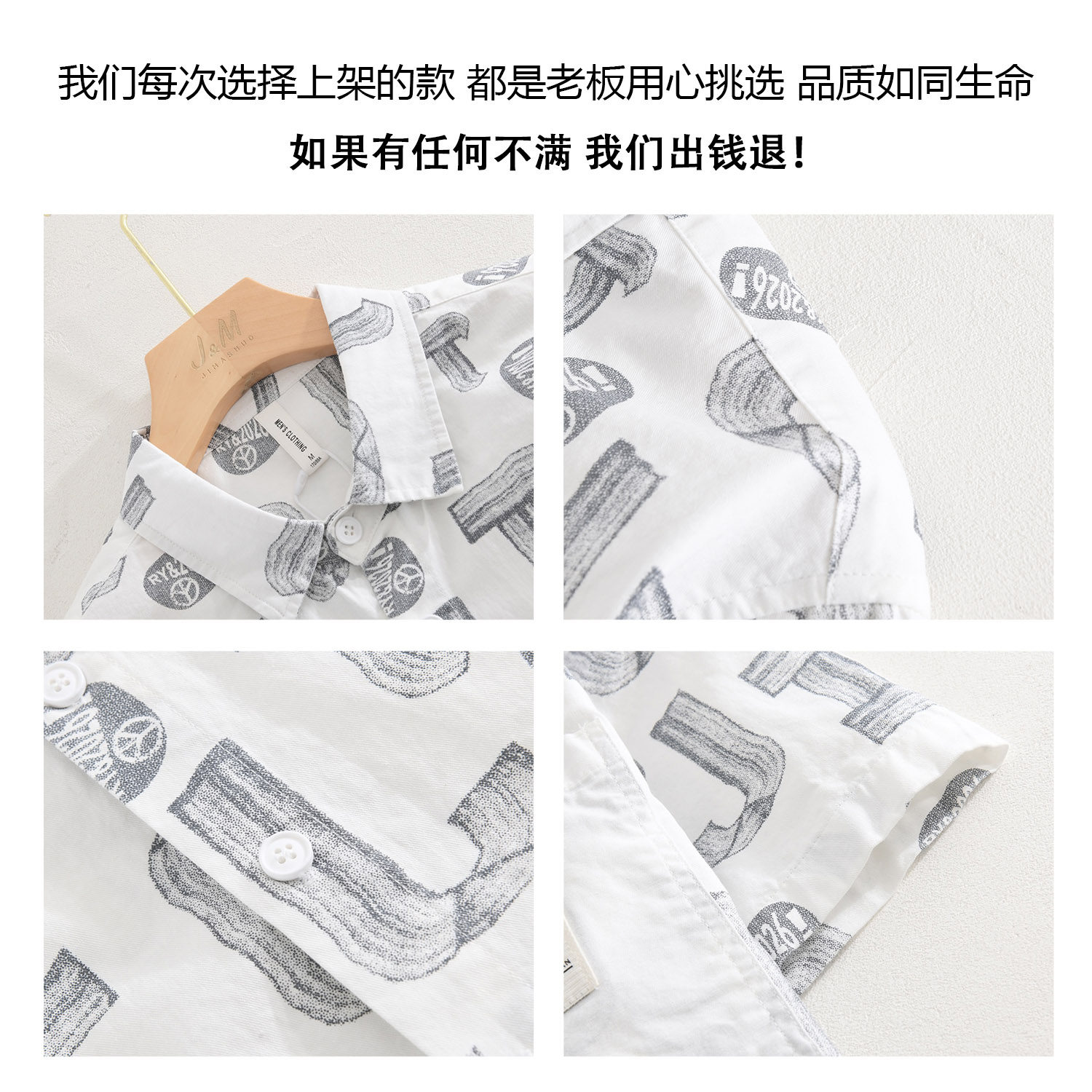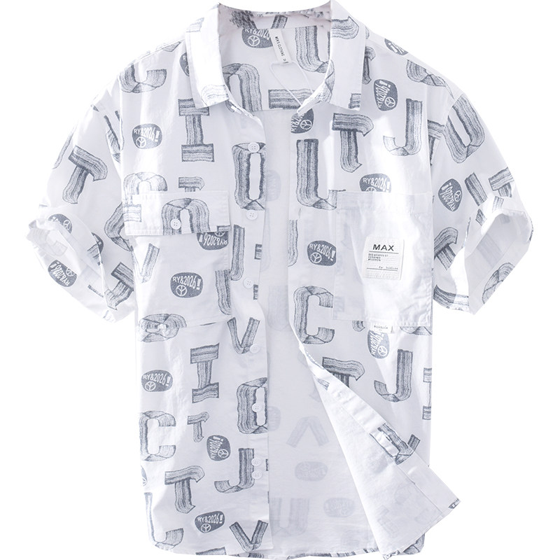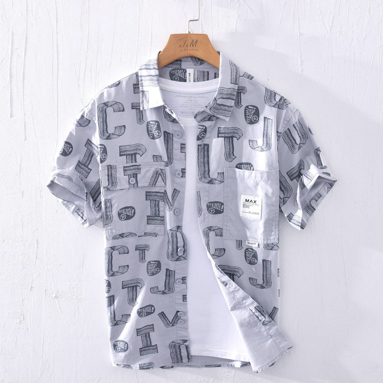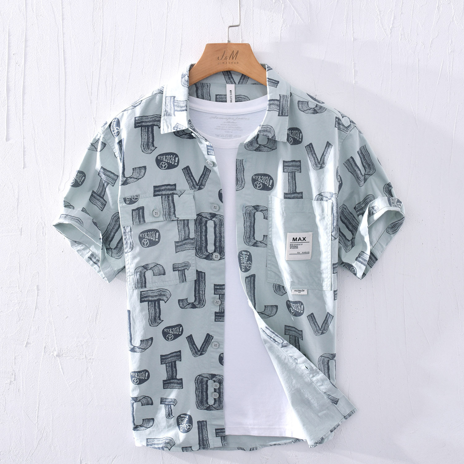 极麻个性清新印花休闲短袖衬衫男士夏季日系潮流青年宽松纯棉衬衣