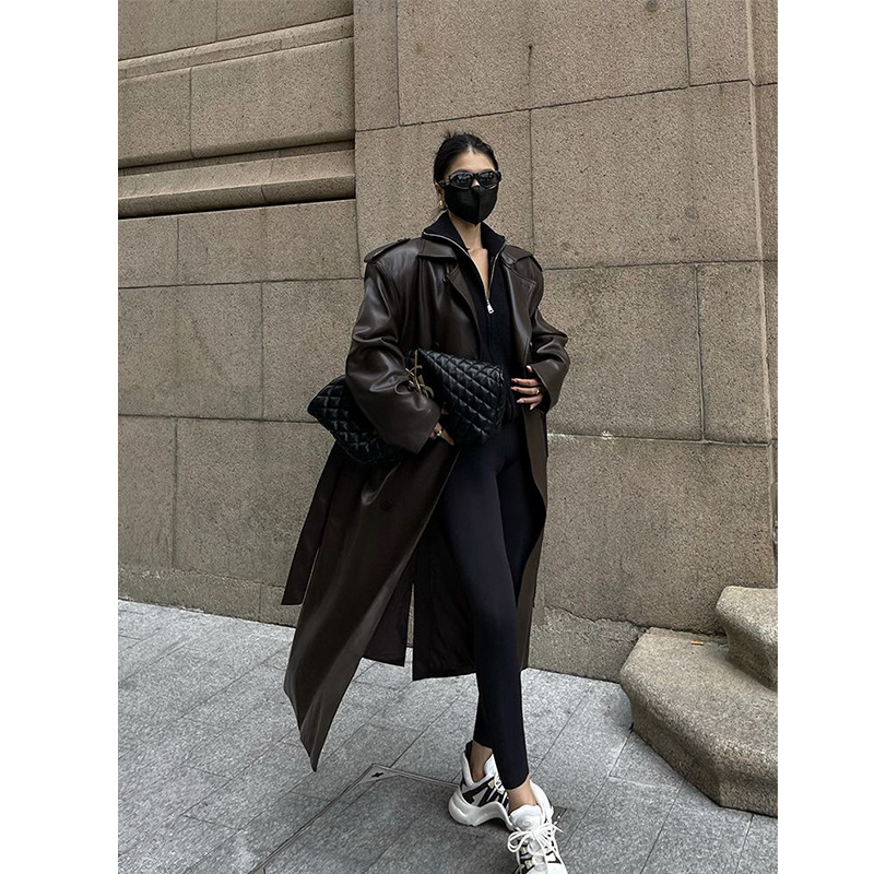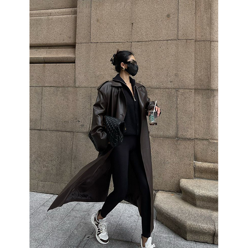 棕色复古中长款过膝pu皮衣外套高级感女2025年春秋新款宽松皮