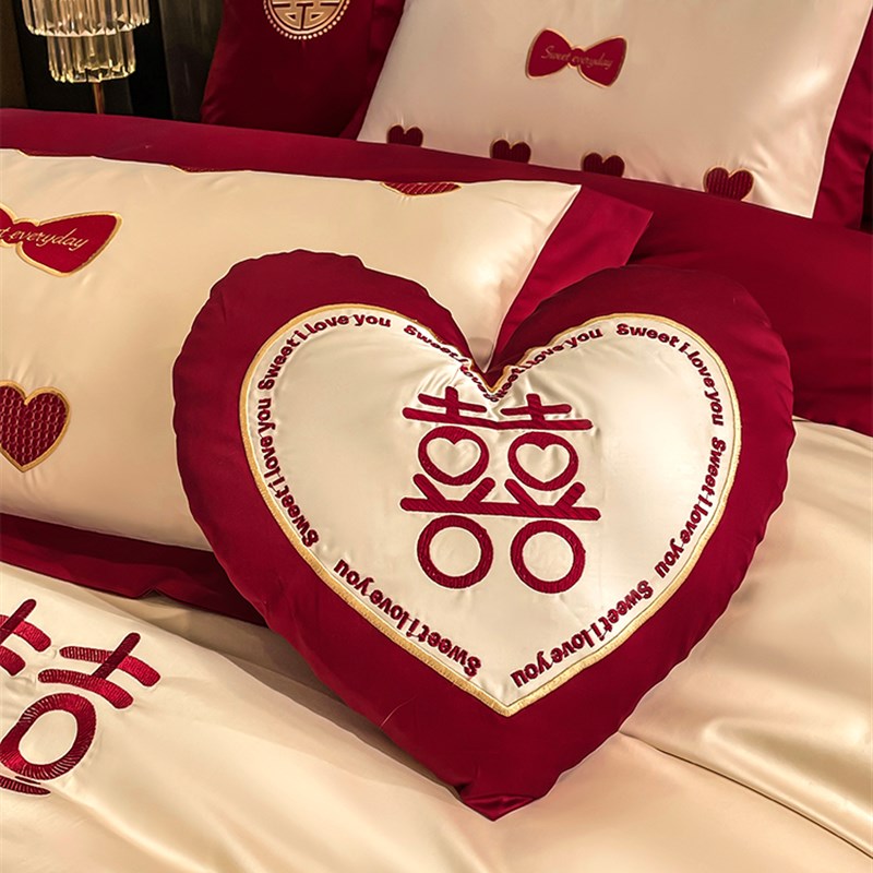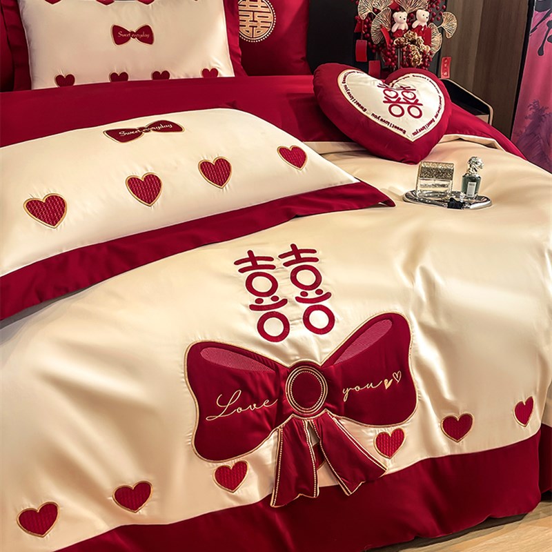 公主风结婚四件套新婚床上用品全棉红色G喜庆100支长绒棉抱枕六件