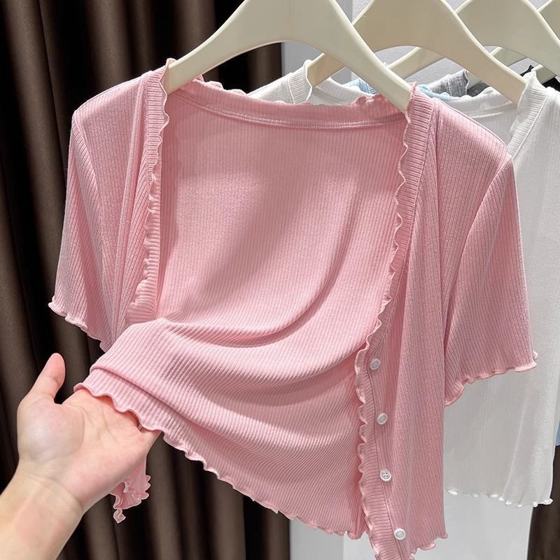 夏日短袖镂空冰丝针织开衫女配吊带裙子外搭罩衫轻薄款小披肩外套