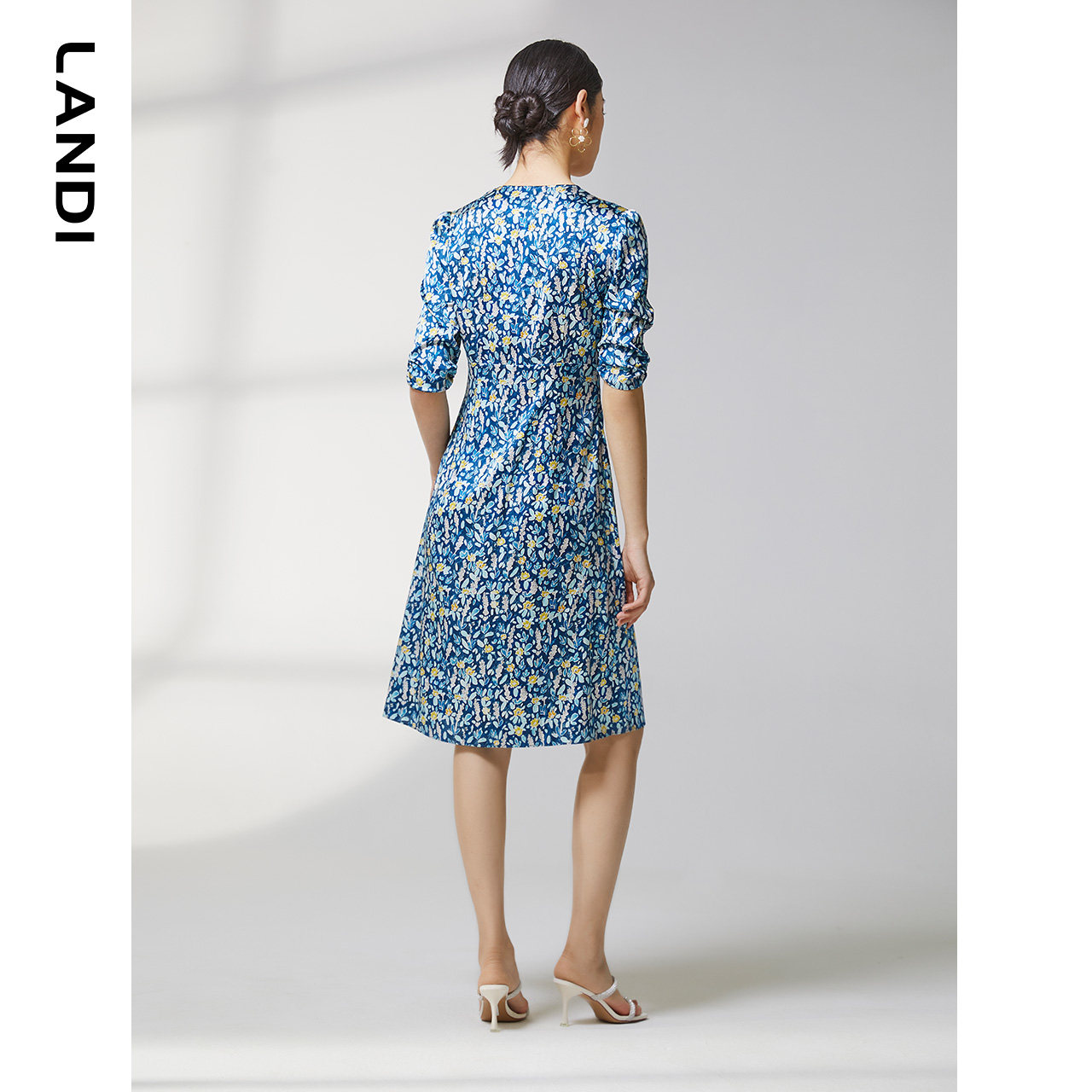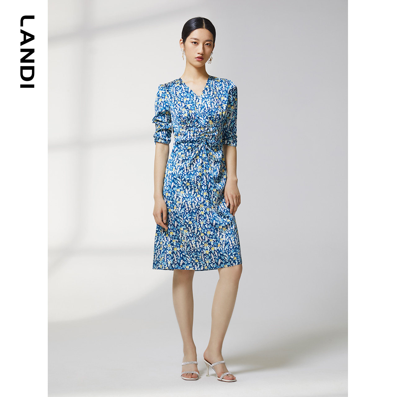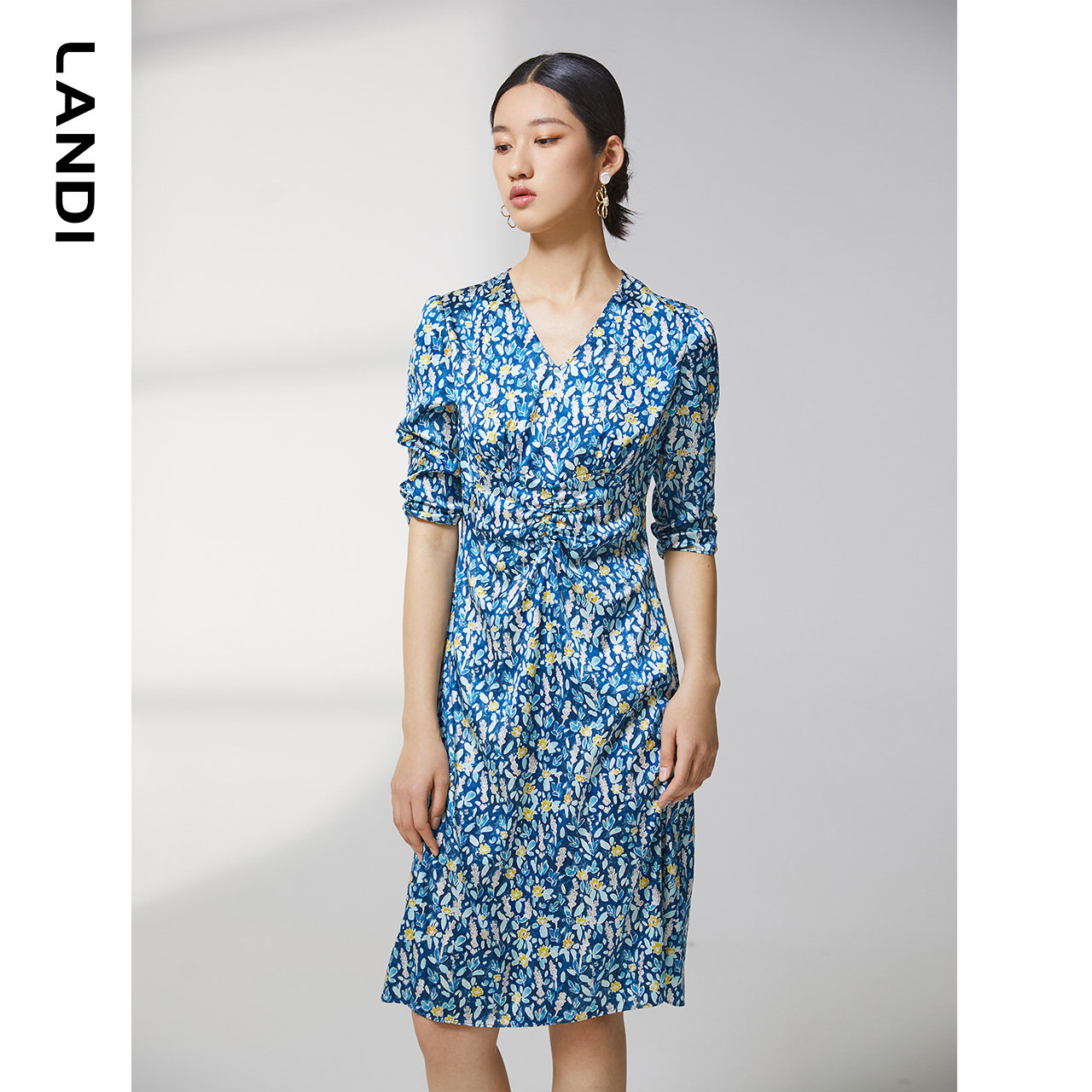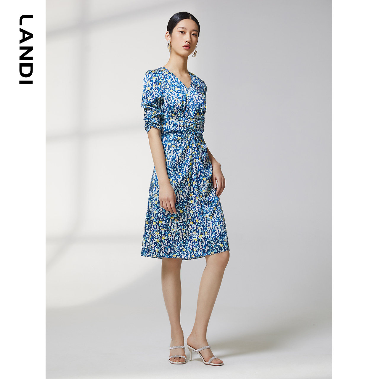 【真丝系列】蓝地夏季新款腰部抽褶碎花印花短袖连衣裙女
