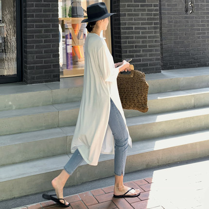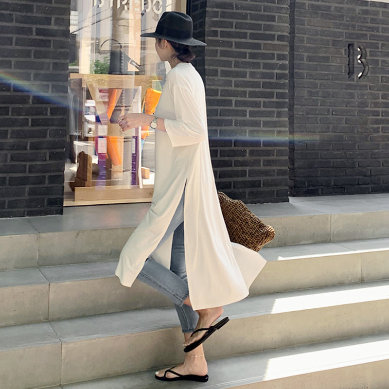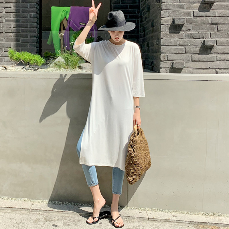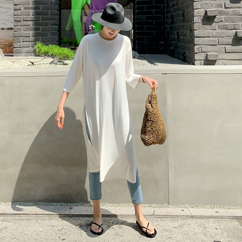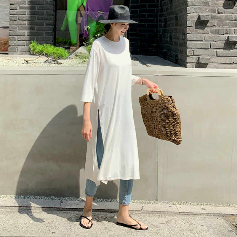 夏季新款七分袖过膝开叉T恤衫女韩版宽松显瘦中长款休闲打底上衣