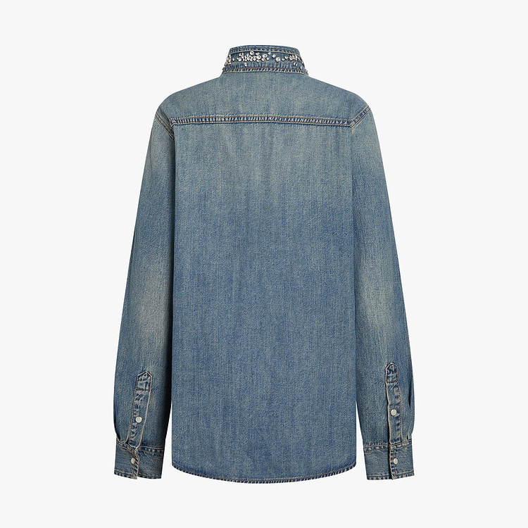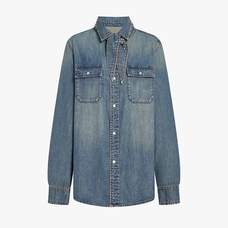 商场同款2026春牛仔衬衫女镶钻领带宽松休闲棉质春秋百搭蓝色上衣