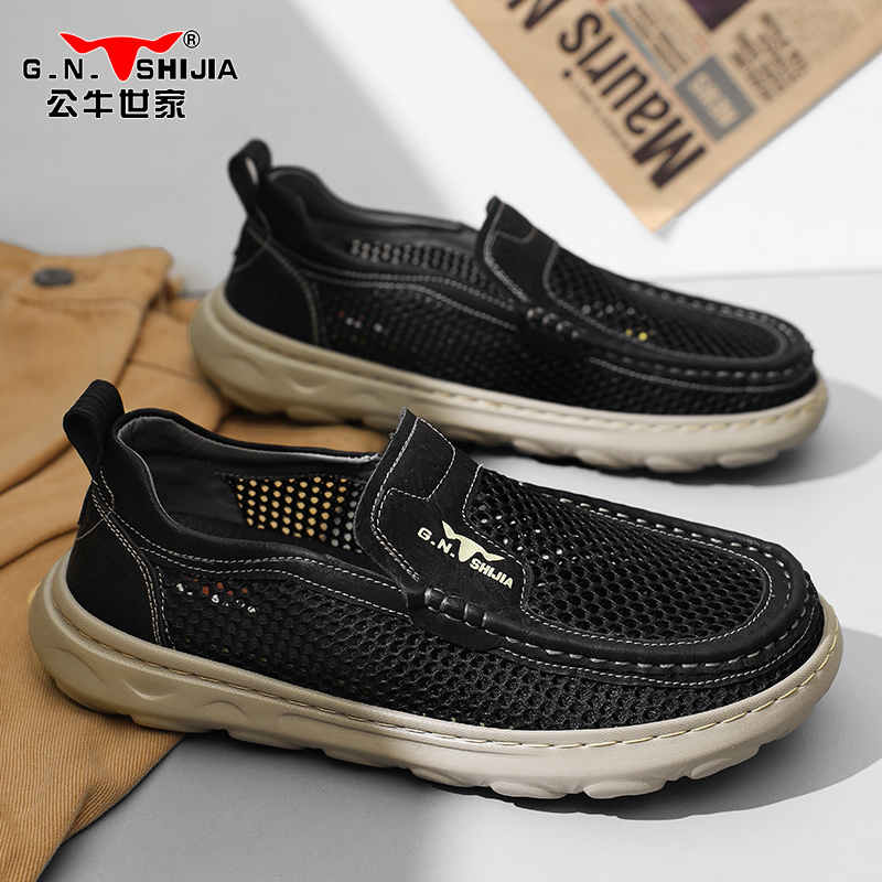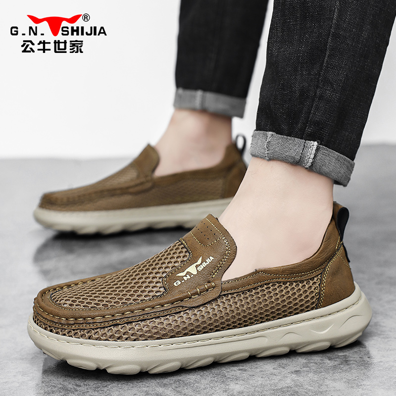 公牛世家豆豆鞋男款2025新款夏季透气镂空皮鞋男软底一脚蹬开车鞋