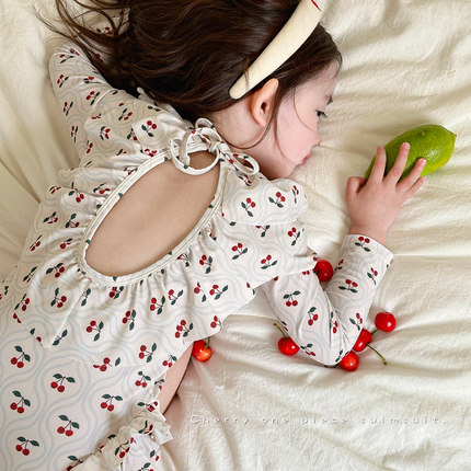女童夏季连体长袖游泳衣女孩速干防晒樱桃花边洋气泳衣宝宝泳装
