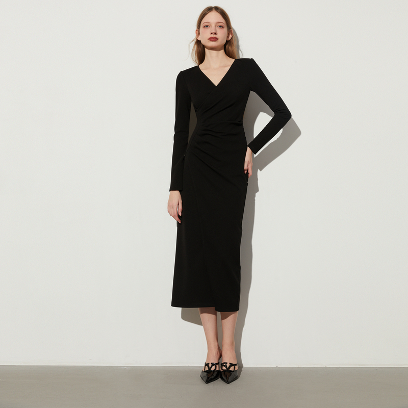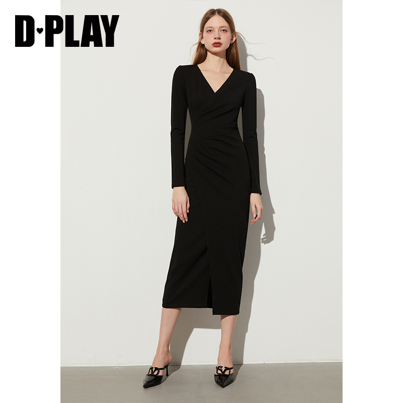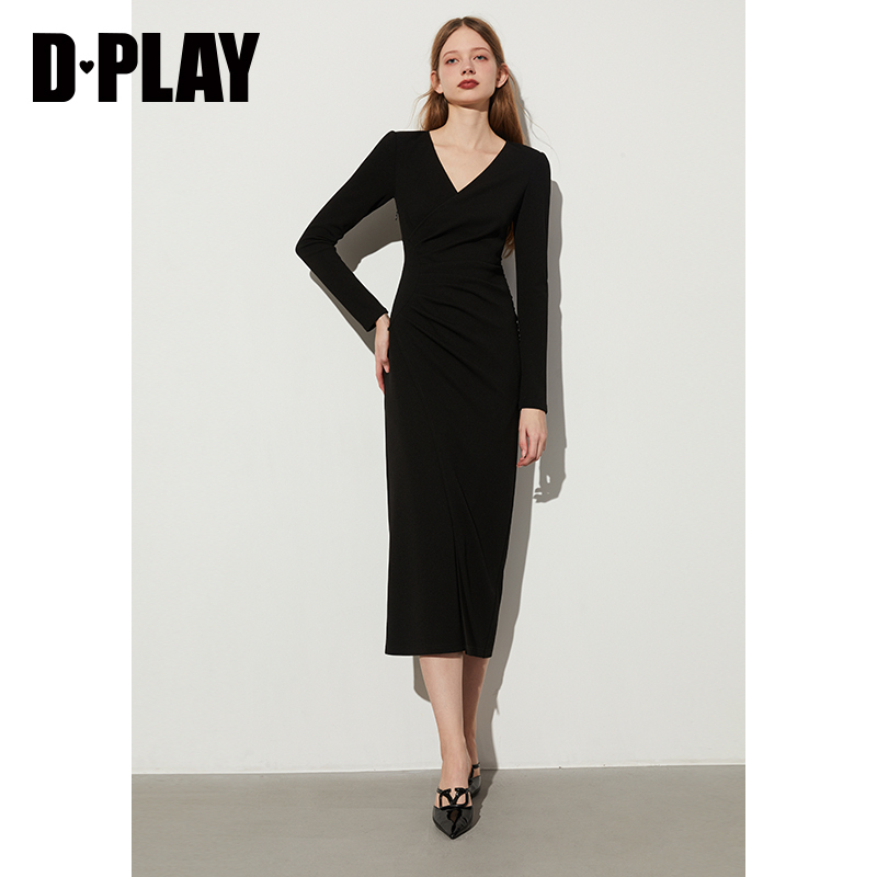 DPLAY秋季法式风V领黑色腰部半圆侧捏褶设计弹力连衣裙长裙女
