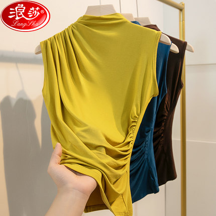 浪莎正品2025秋季新款半高领打底衫女修身女装短袖纯色无袖T恤