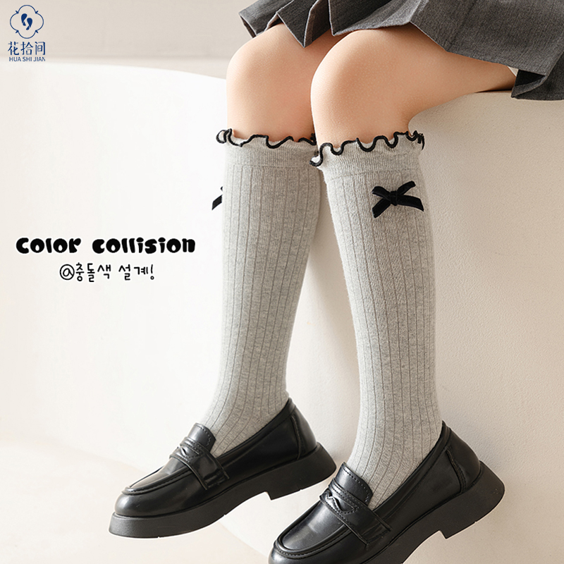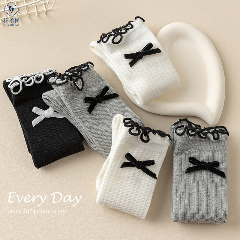 女童长筒袜春秋纯棉儿童蝴蝶结花边小腿袜黑白色复古女童高筒袜