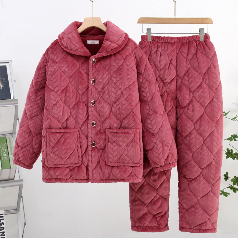 冬季女士中老年加厚法兰绒三层夹棉睡衣冬款妈妈珊瑚绒家居服套装