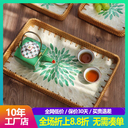 东南亚进口手工藤编贝壳托盘水果盘家用客厅点心收纳茶盘贝母方盘