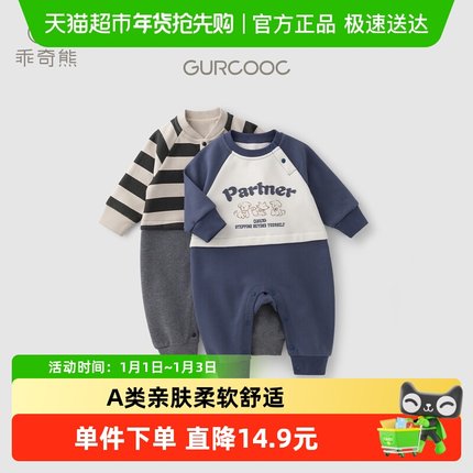 乖奇熊秋冬季男宝宝纯棉抓绒连体哈衣服婴儿休闲外穿假两件爬爬服