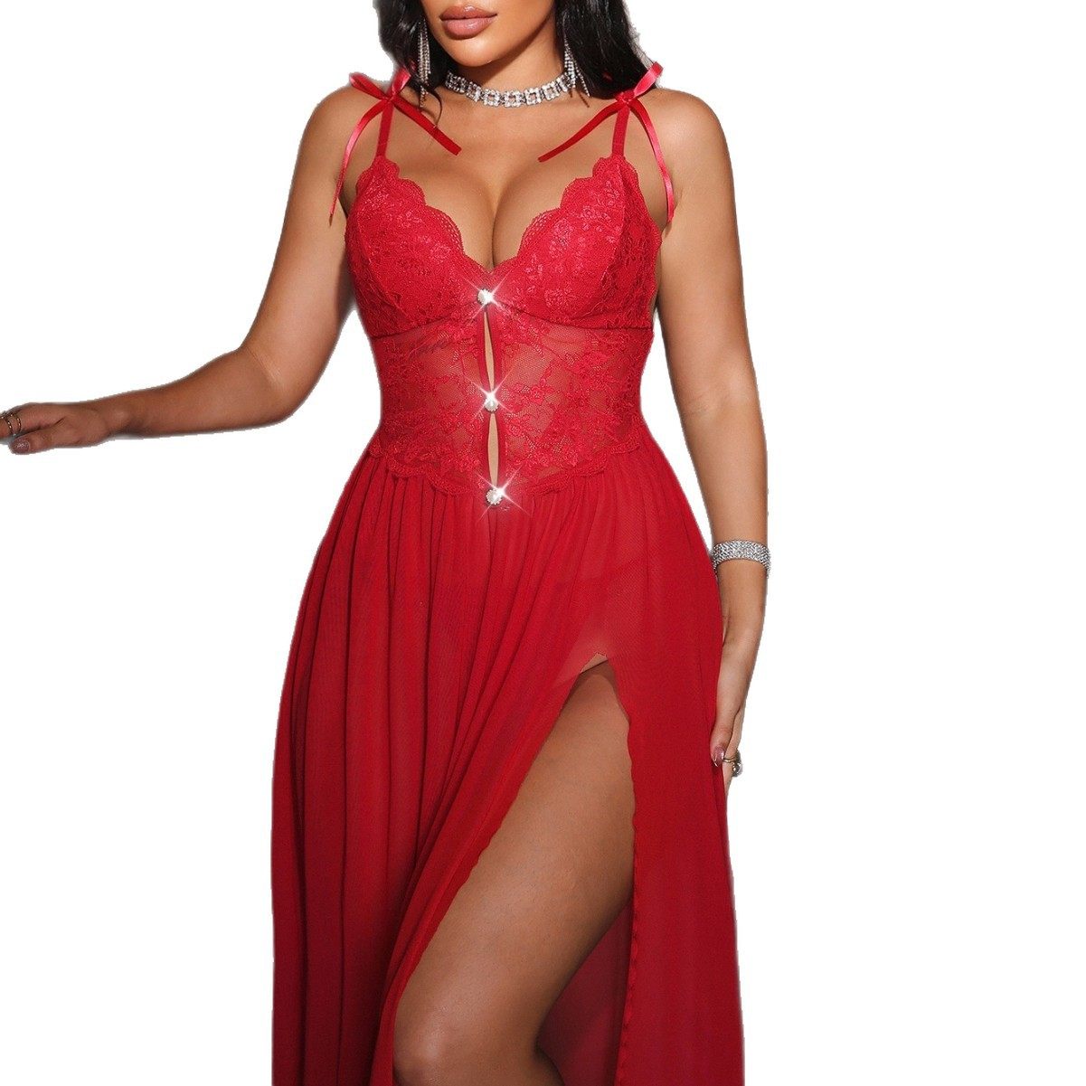 欧美风性感纯欲深V领蕾丝长款连衣裙女高开叉网纱拼接绑带睡裙ins