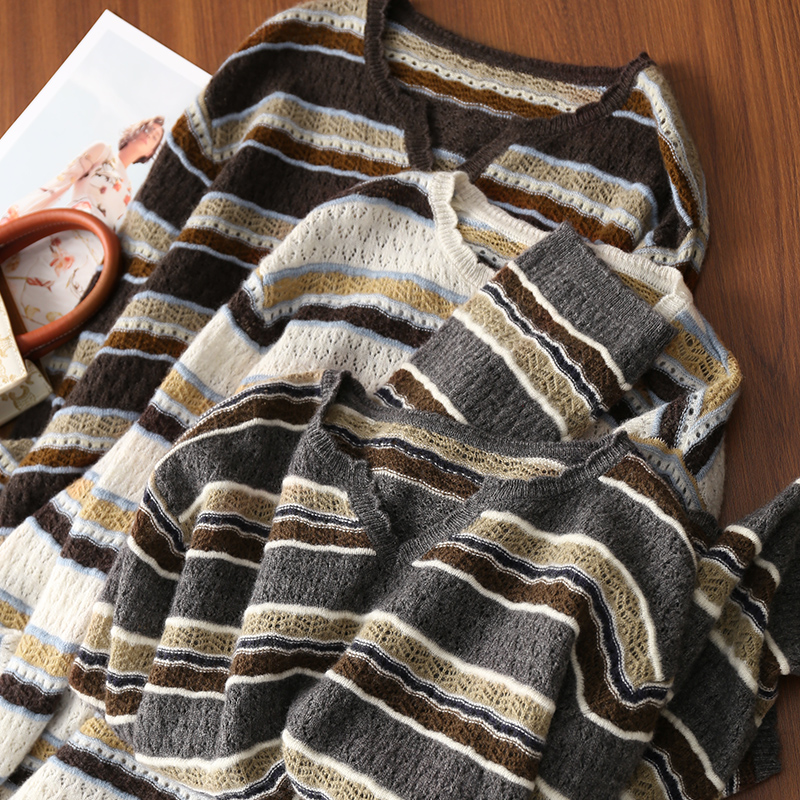 淘么淘 低饱和条纹 柔软羊绒+羊毛镂空钩花剪刀领长袖针织衫毛衣