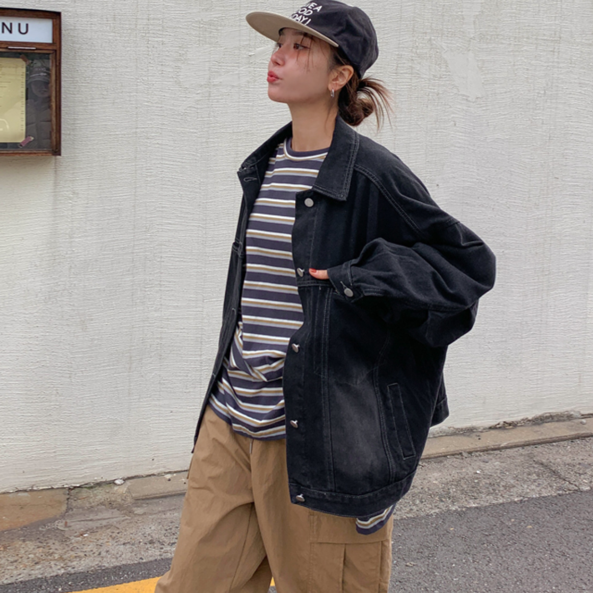 韩国特大码女装胖mm秋装新品时尚磨白翻领大口袋宽松牛仔外套1027