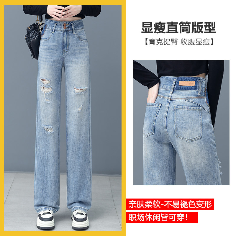 破洞直筒牛仔裤女宽松显瘦春秋2026年新款高腰时尚百搭垂感阔腿裤