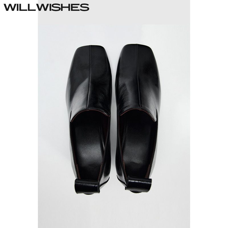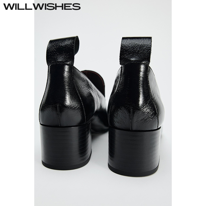 WILLWISHES 王玎设计女鞋秋季新款方头粗跟乐福鞋女黑色单鞋#473