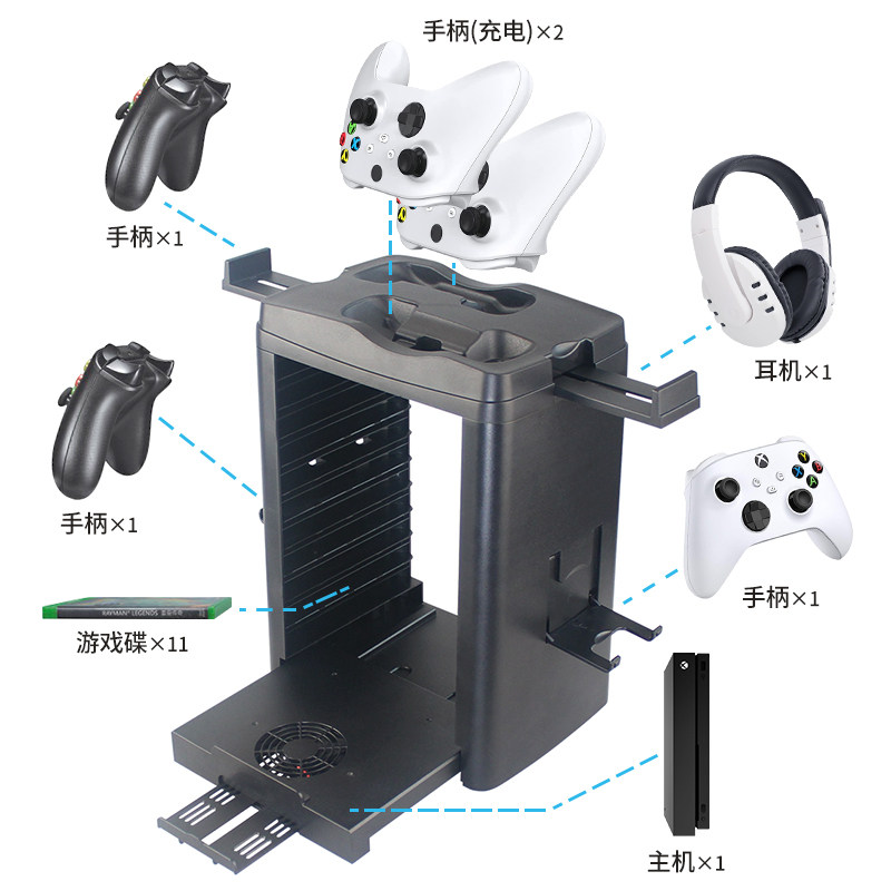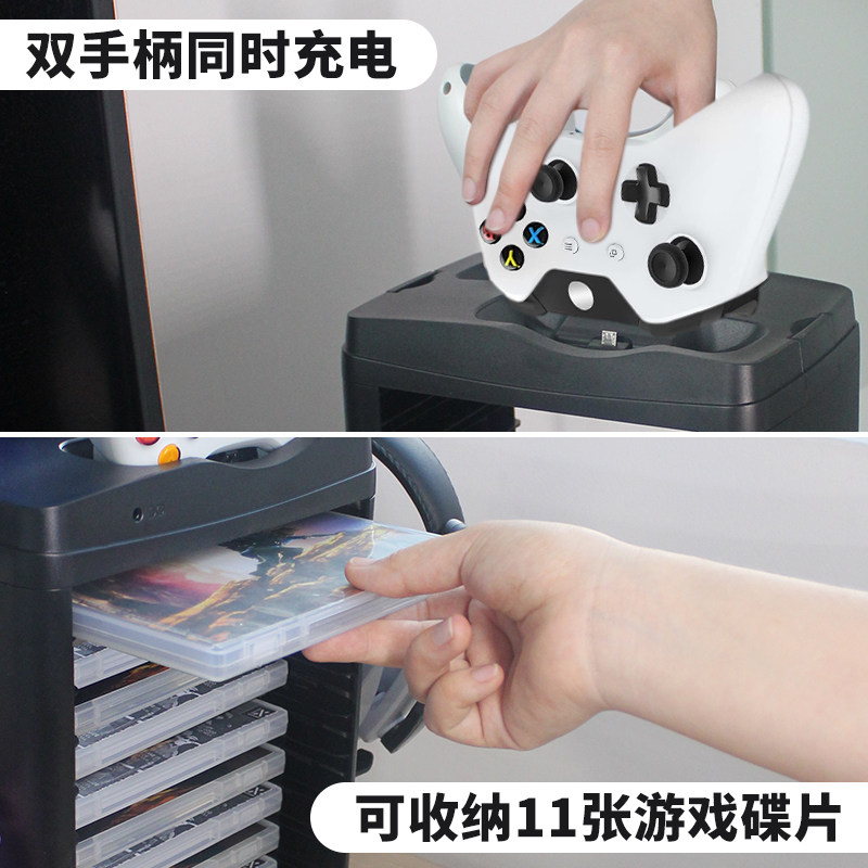 适用于XBOX ONE/X/S主机散热游戏手柄可双充可单充收纳底座 四合一多功能碟片收纳可放耳机可收收纳架 傲硕