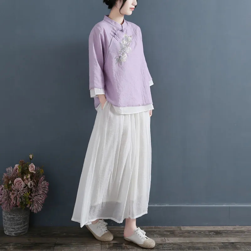 复古盘扣刺绣棉麻衬衫七分袖拼接