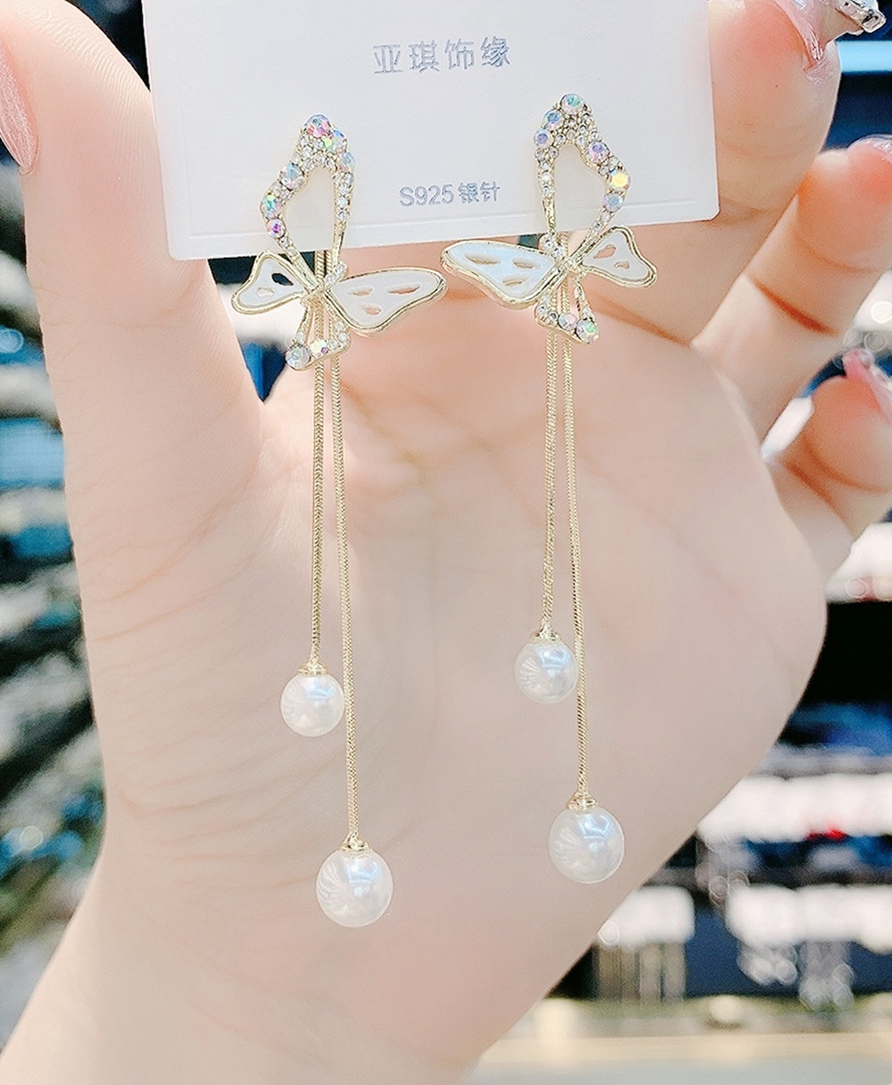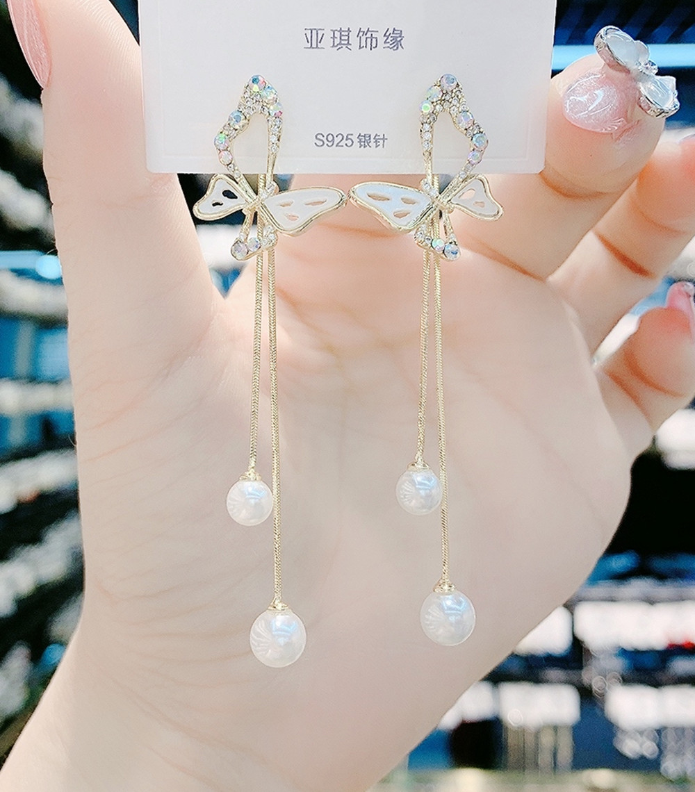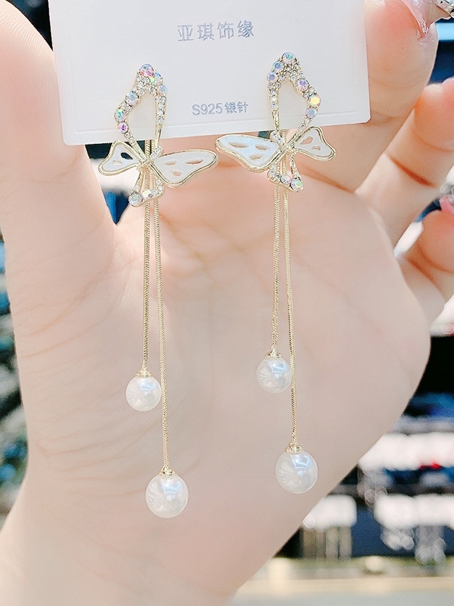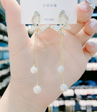 日韩长款气质蝴蝶流苏耳环女两戴时尚百搭s925银针显脸瘦珍珠耳饰