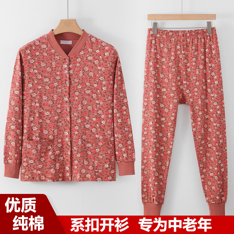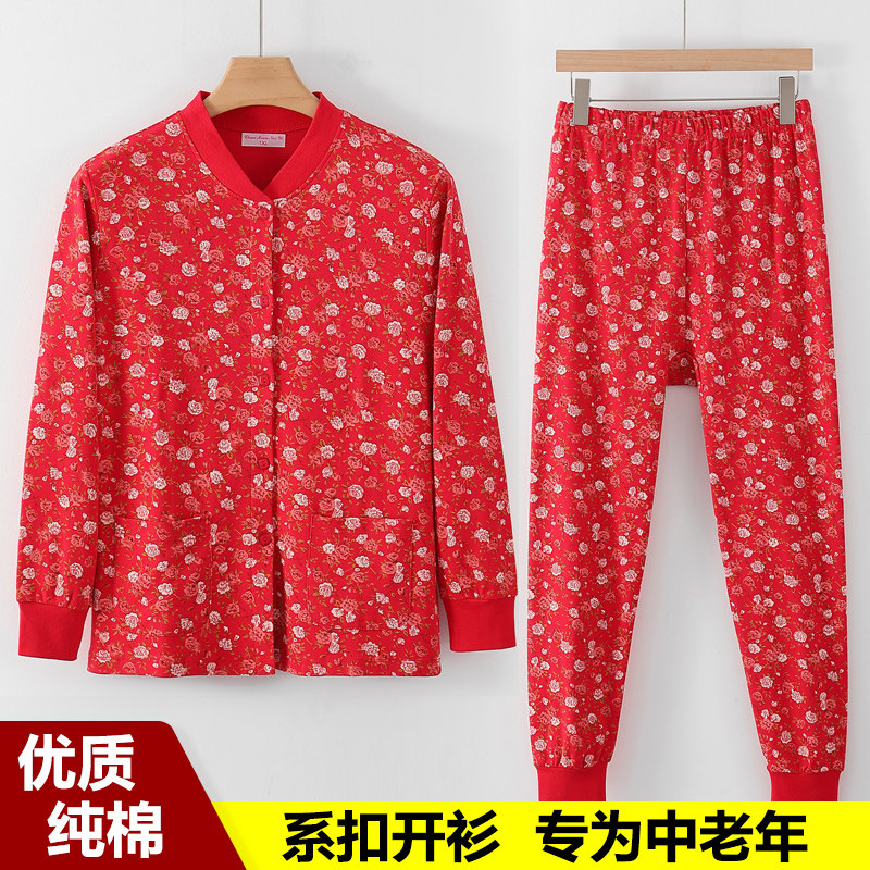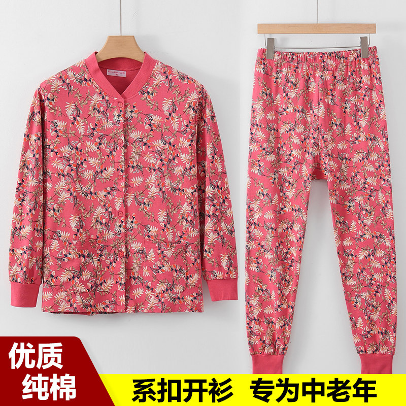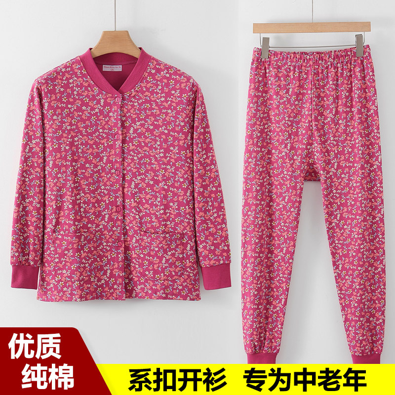 中老年开衫保暖内衣女妈妈纯棉线衣秋裤套装老太太加肥加大棉毛衫