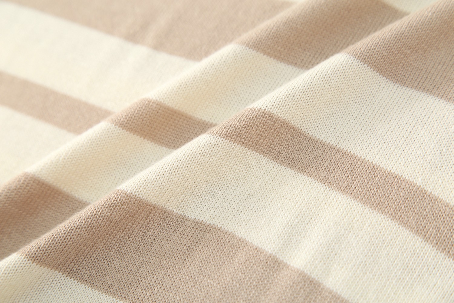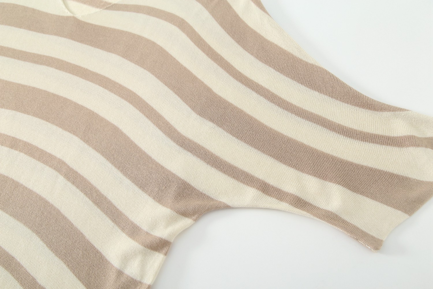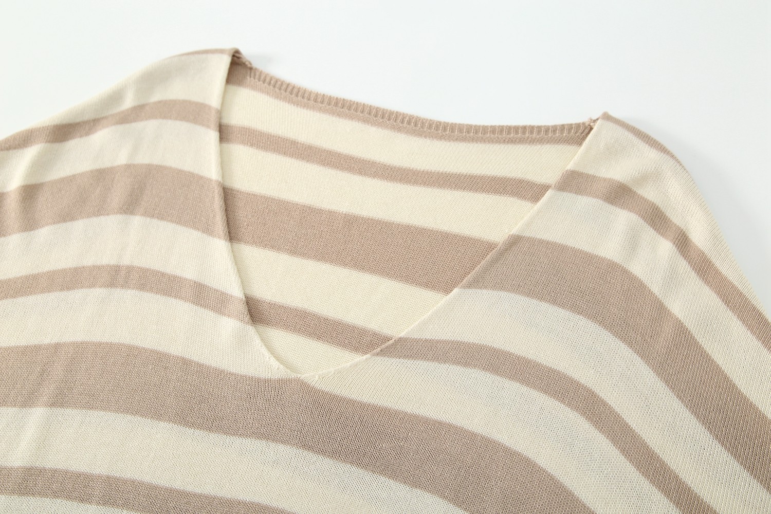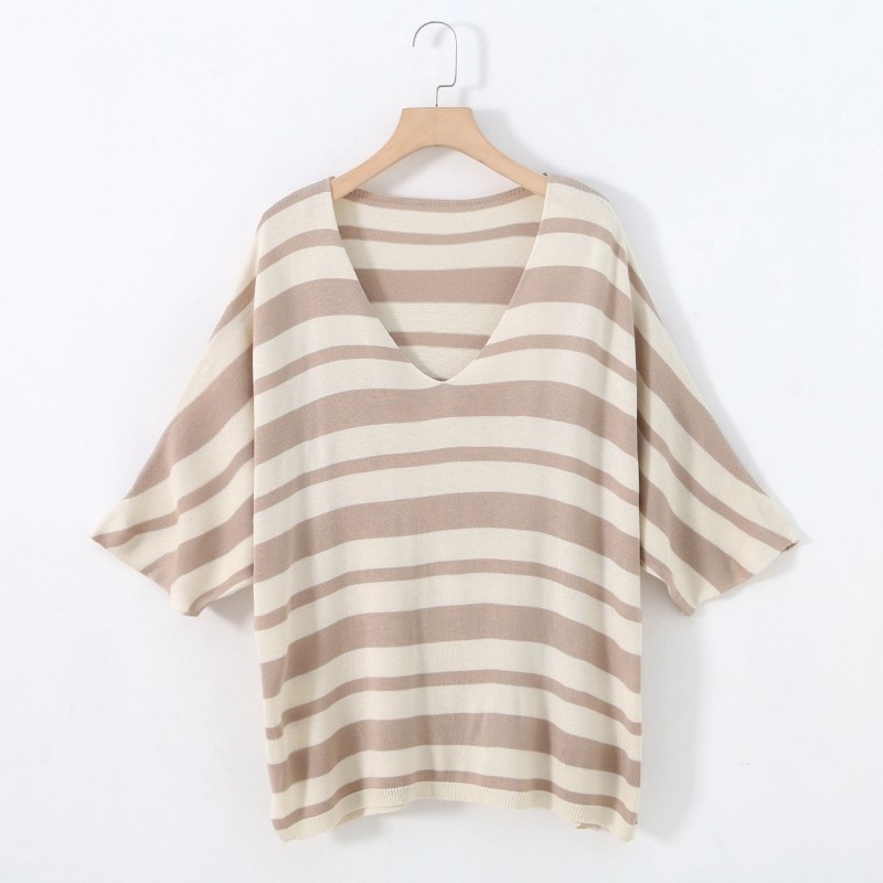 大码V领套头毛衣女秋季新款撞色条纹宽松气质针织衫五分袖上衣薄