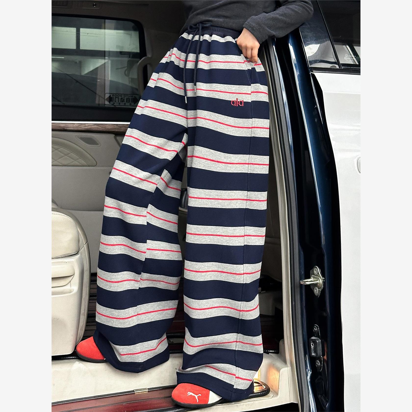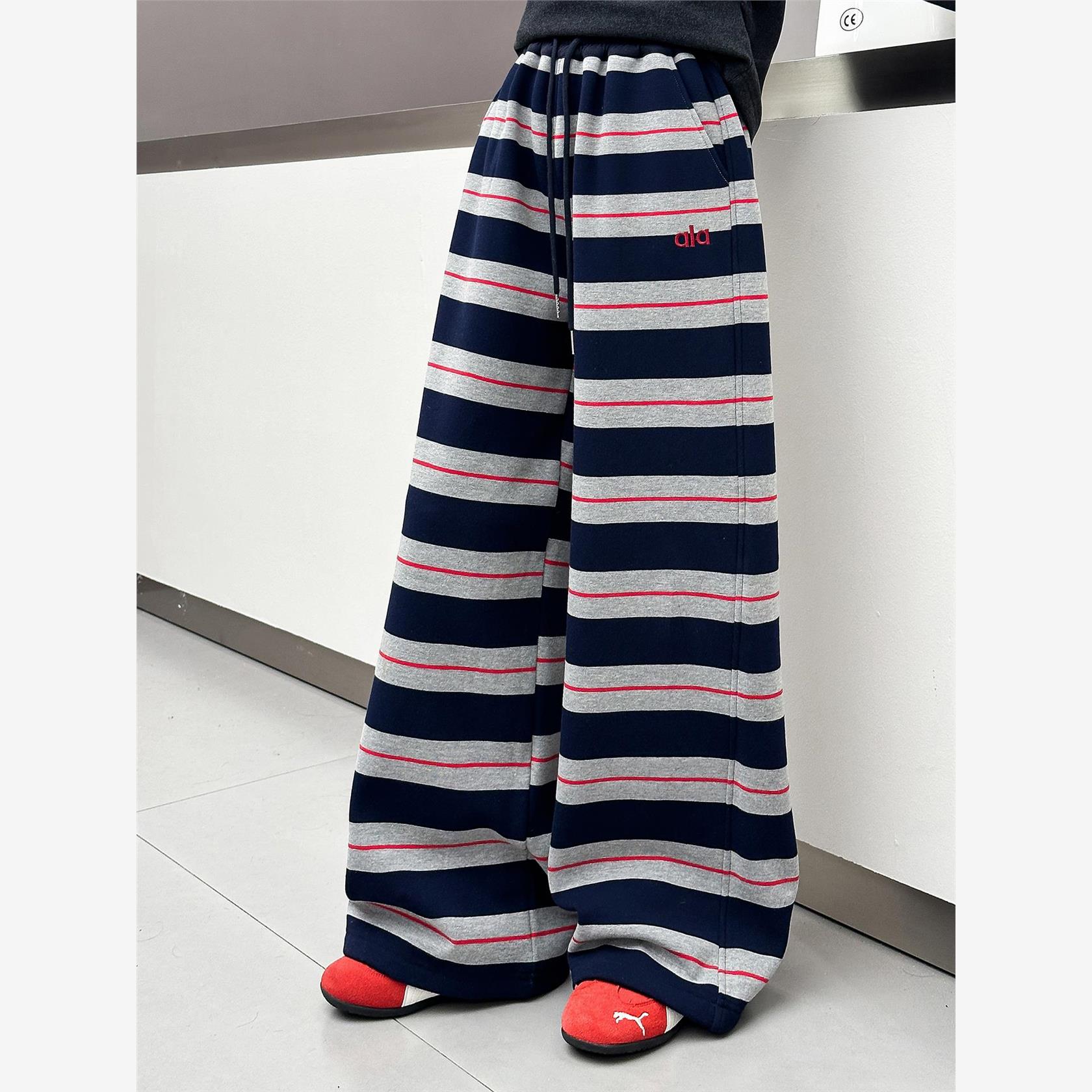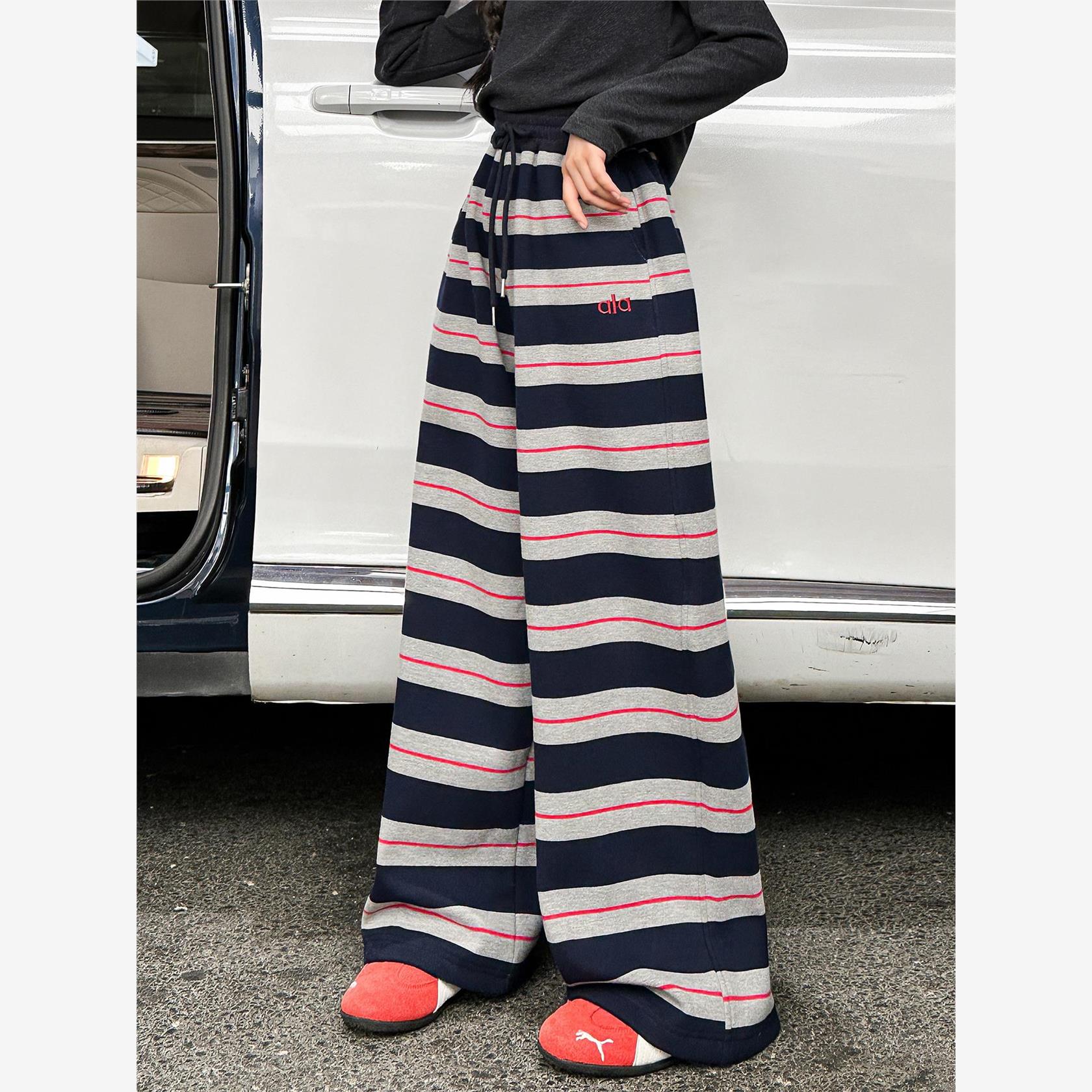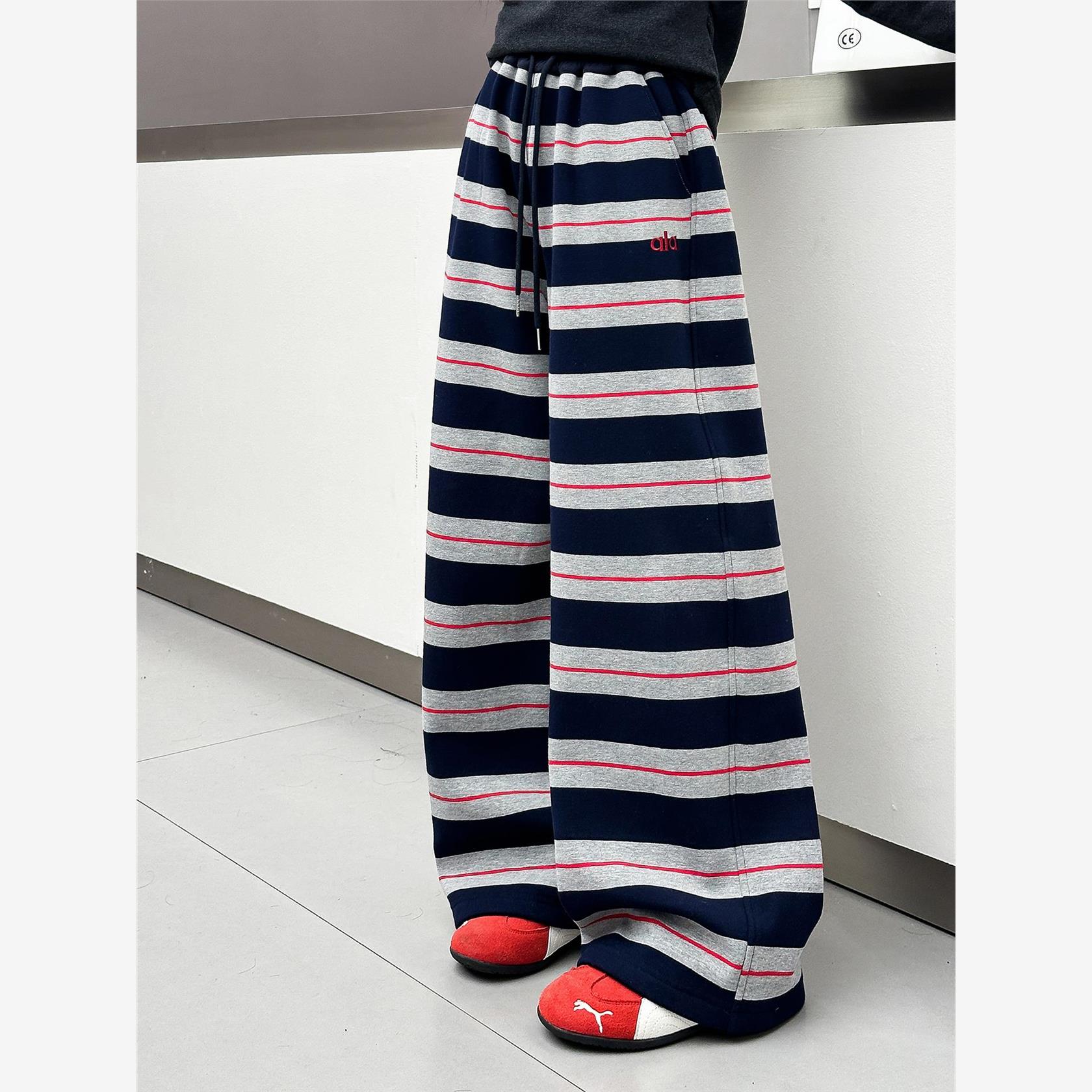 女童加绒裤子秋冬2025新款休闲女大童时髦条纹阔腿裤儿童百搭长裤