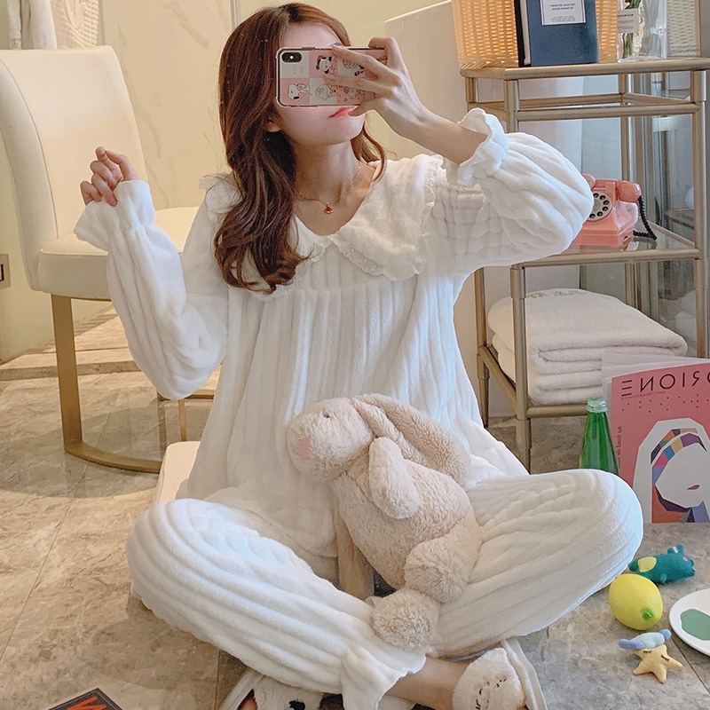 珊瑚绒睡衣女秋冬季加绒加厚法兰绒家居服套装清新学生简约公主风