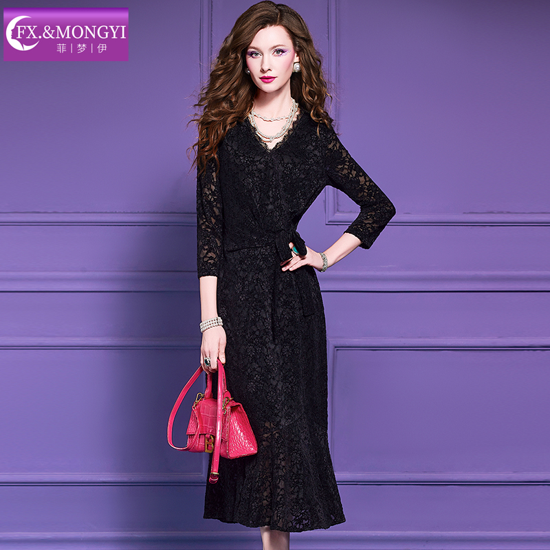 菲梦伊水溶蕾丝黑色连衣裙女秋季轻熟御姐性感气质高贵感中长裙子