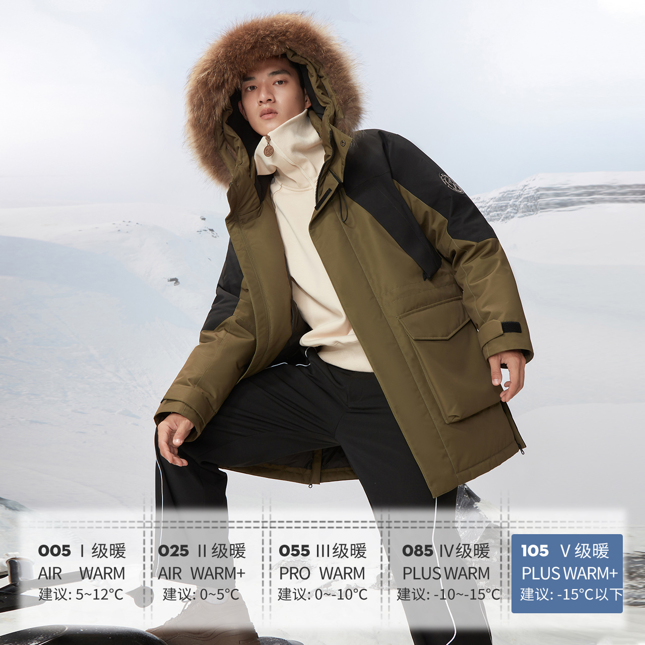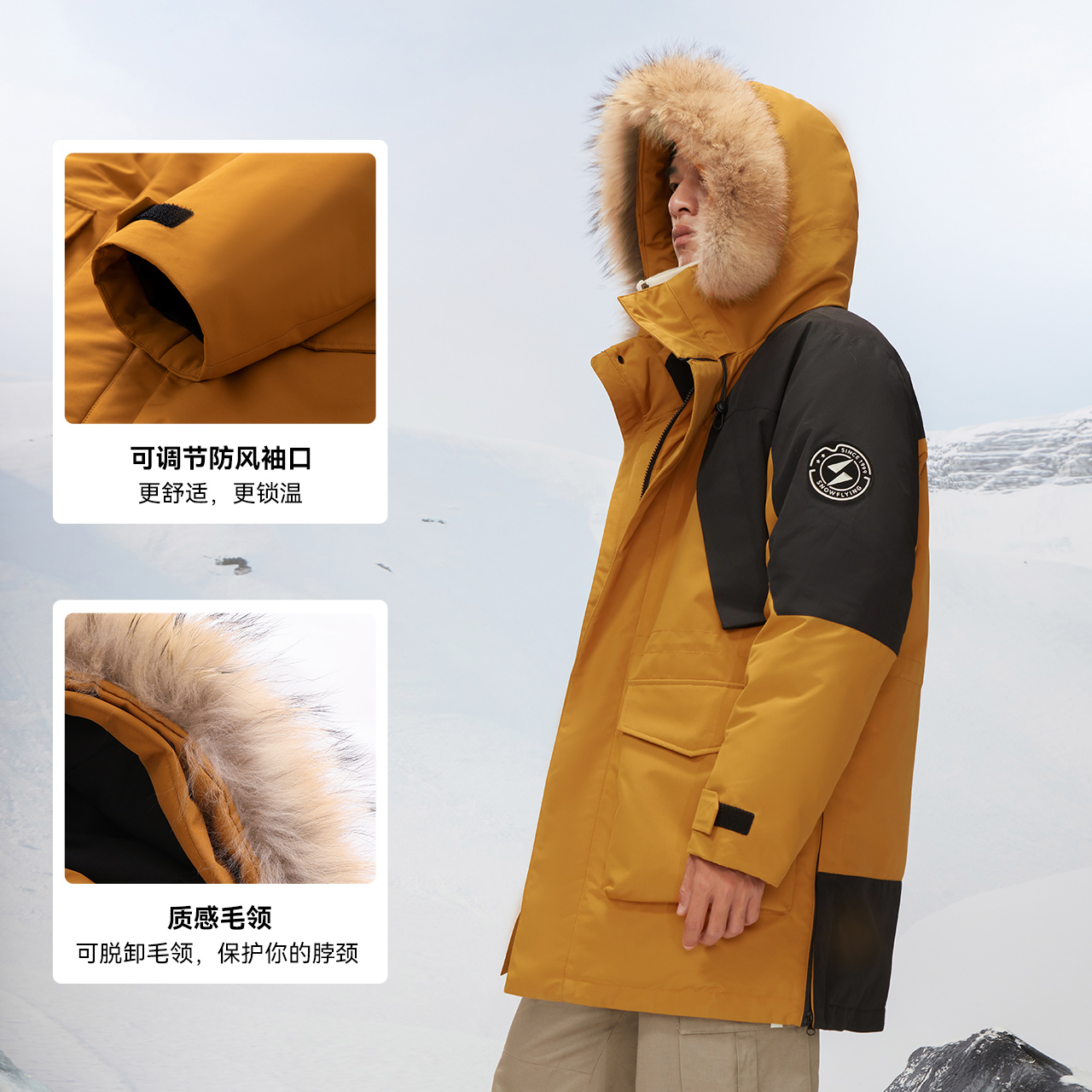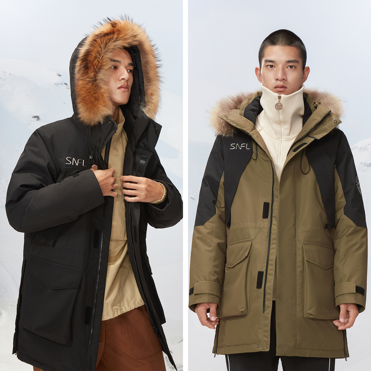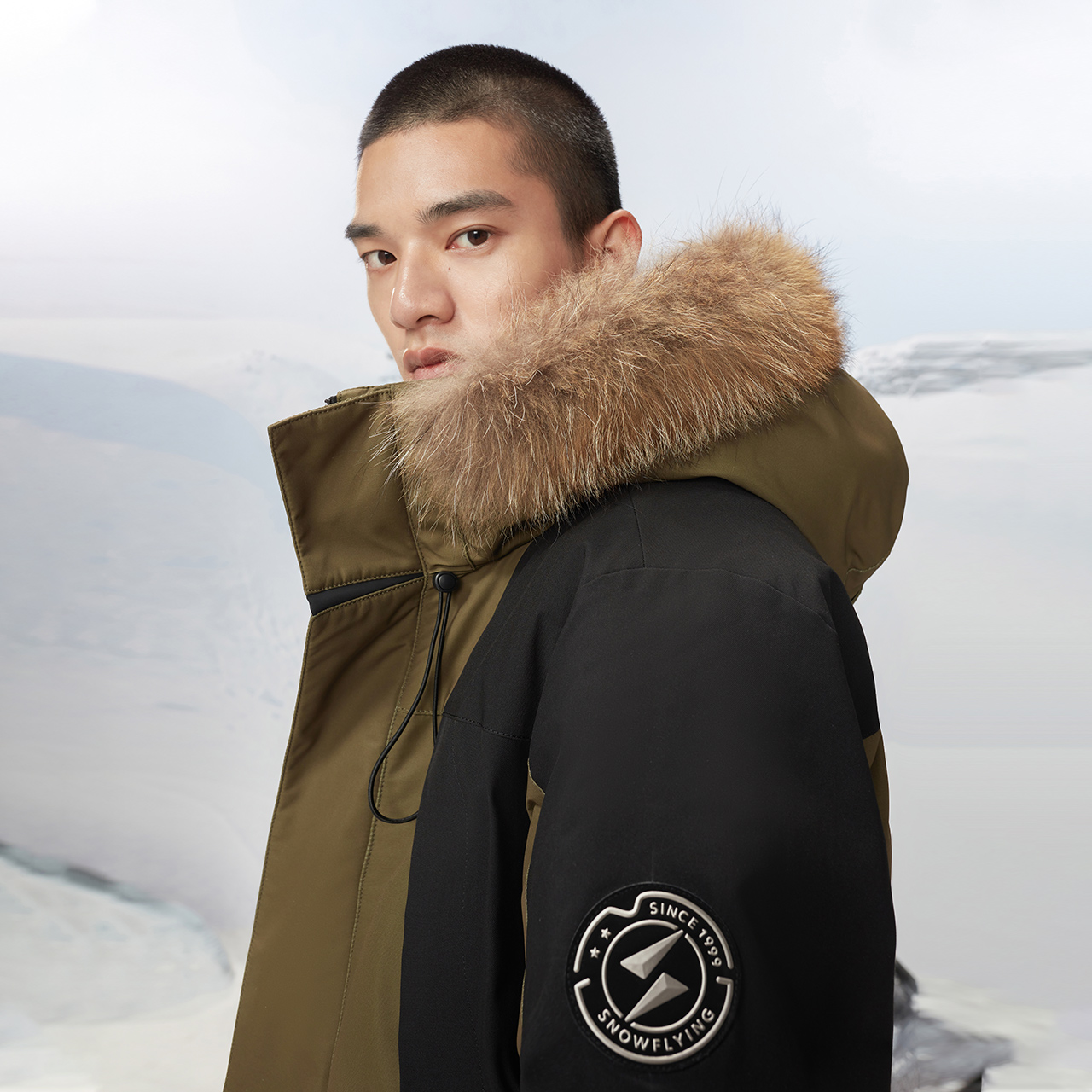 雪中飞冬新款高峰滑雪男士短款连帽工装拼接时尚貉子毛领羽绒服