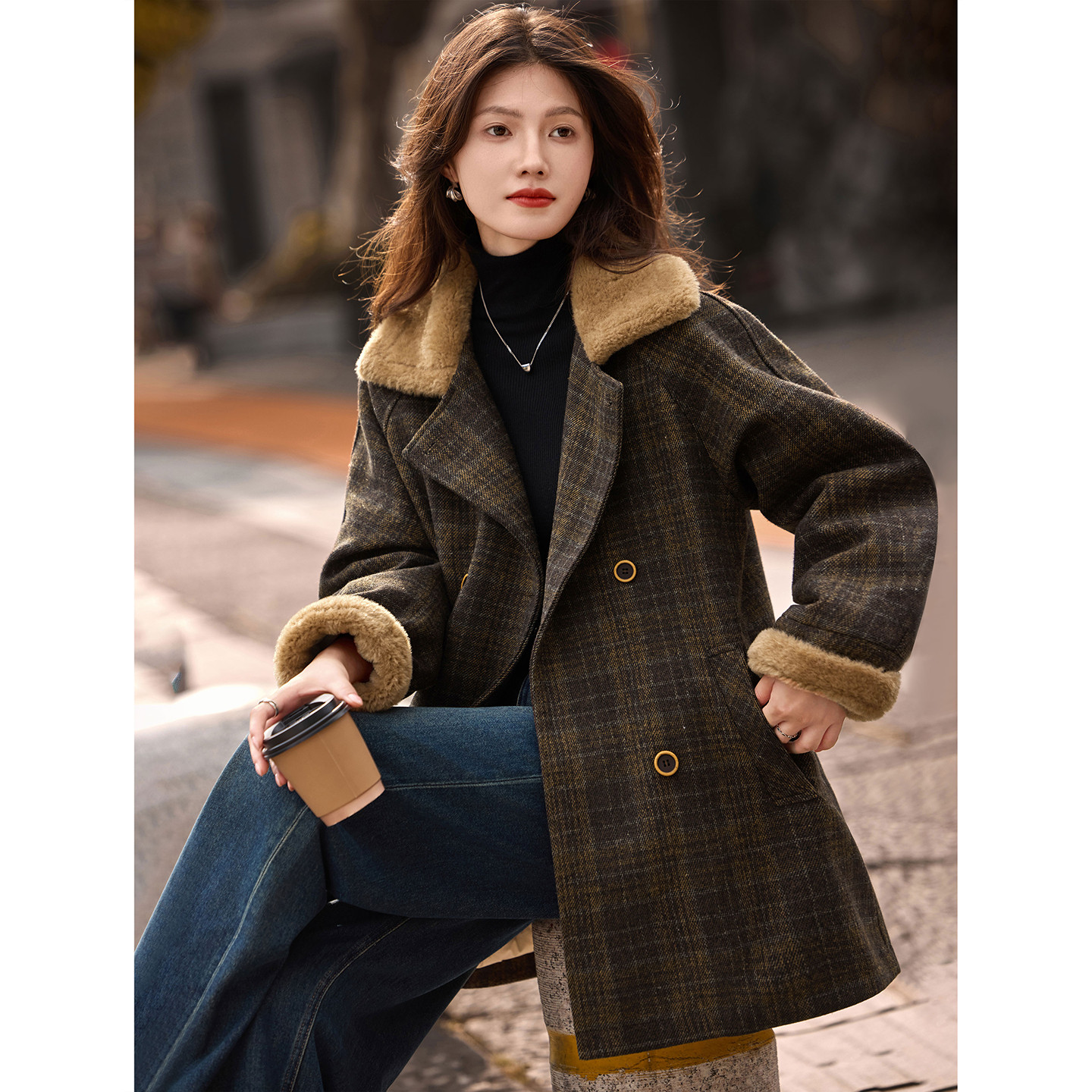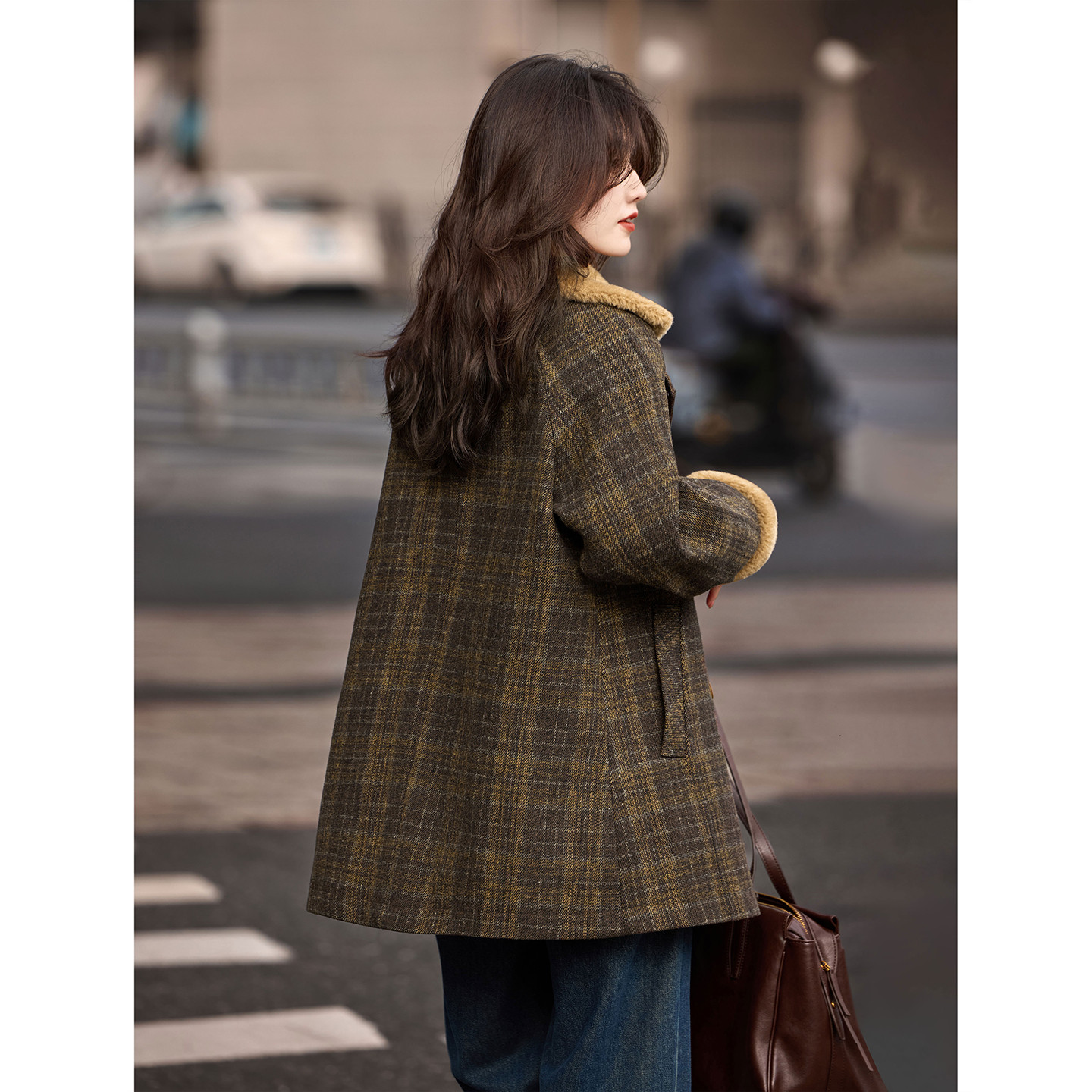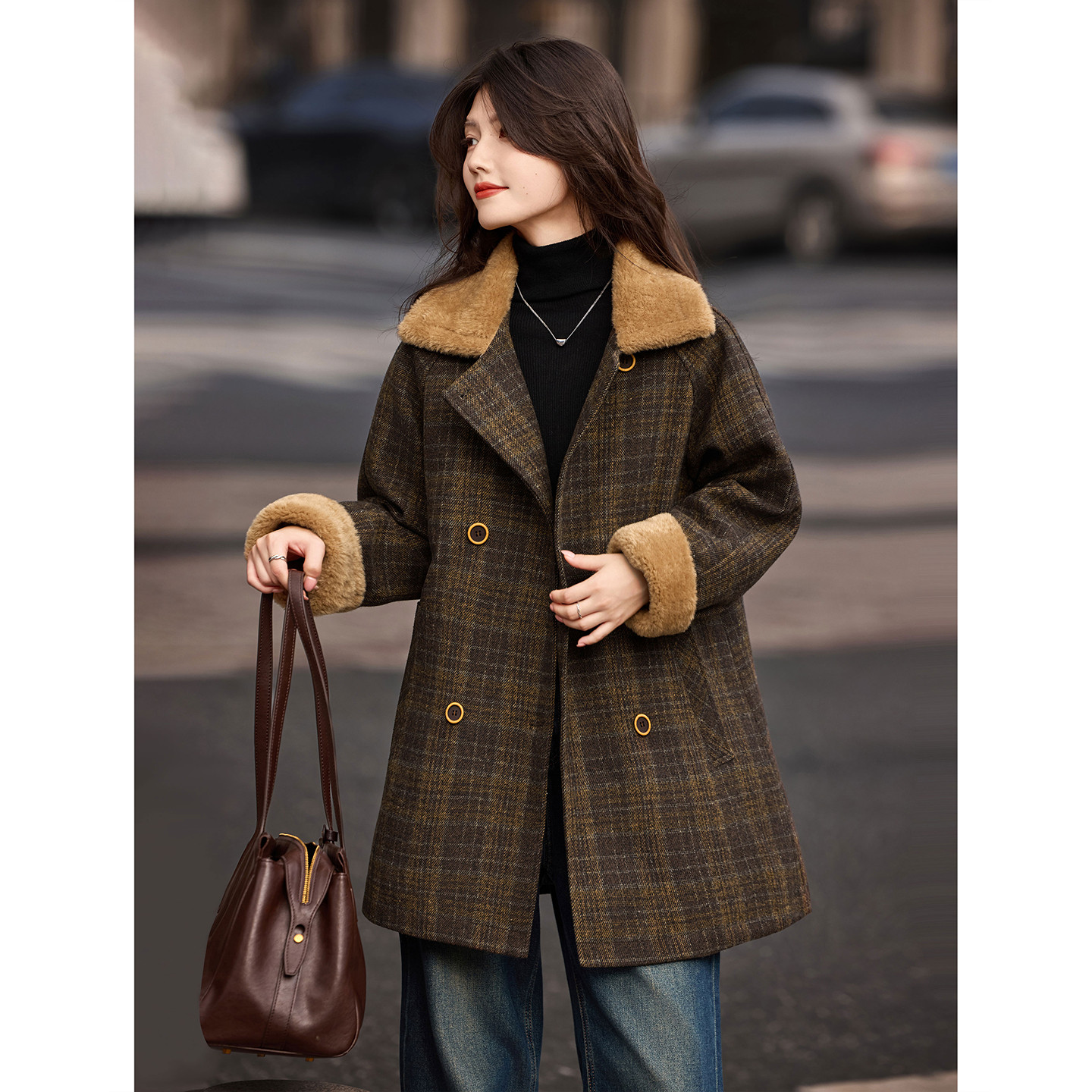 苏醒的乐园格纹羽绒服大衣2025新款冬季中长款呢子外套上衣女装