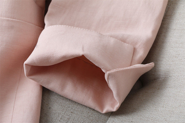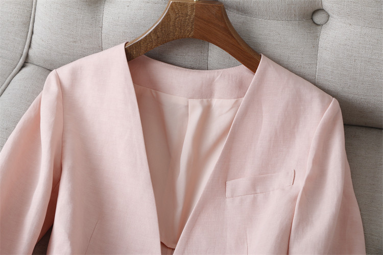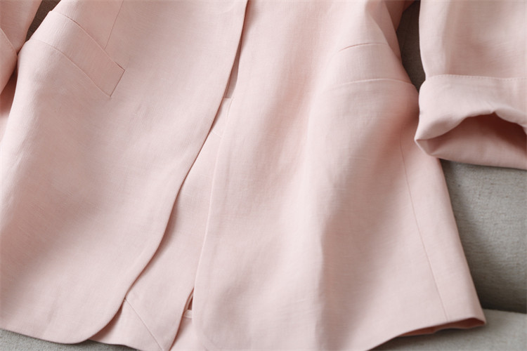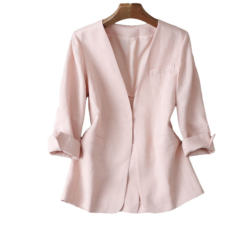 自带美颜!显白粉色V领无扣七分袖中长薄款透气棉麻西装外套女夏