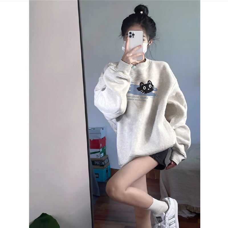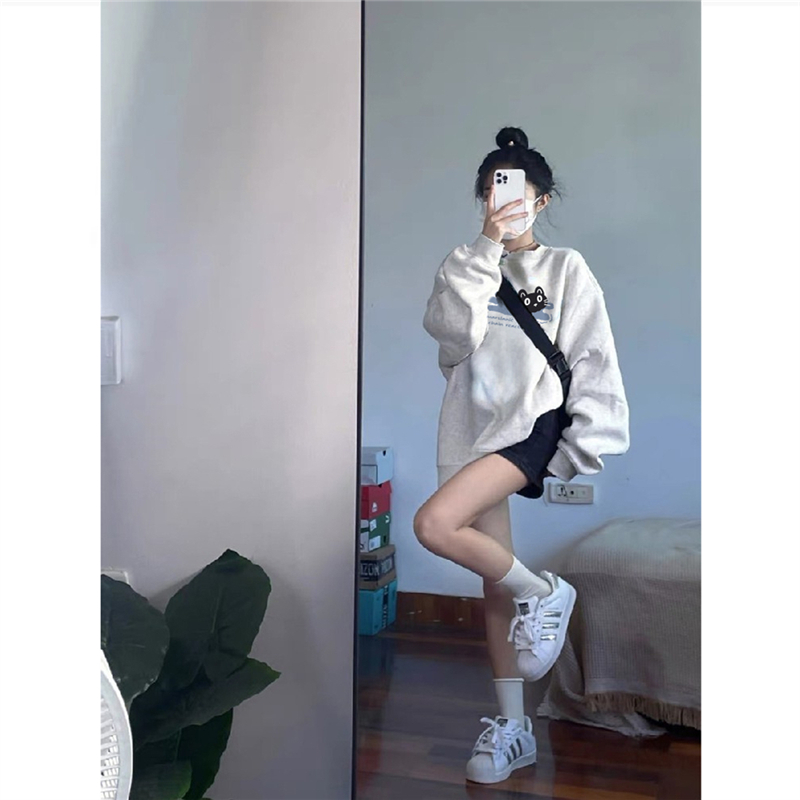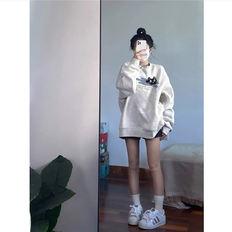 纯棉美式复古灰色正肩圆领卫衣女2025新款小个子宽松慵懒长袖上衣